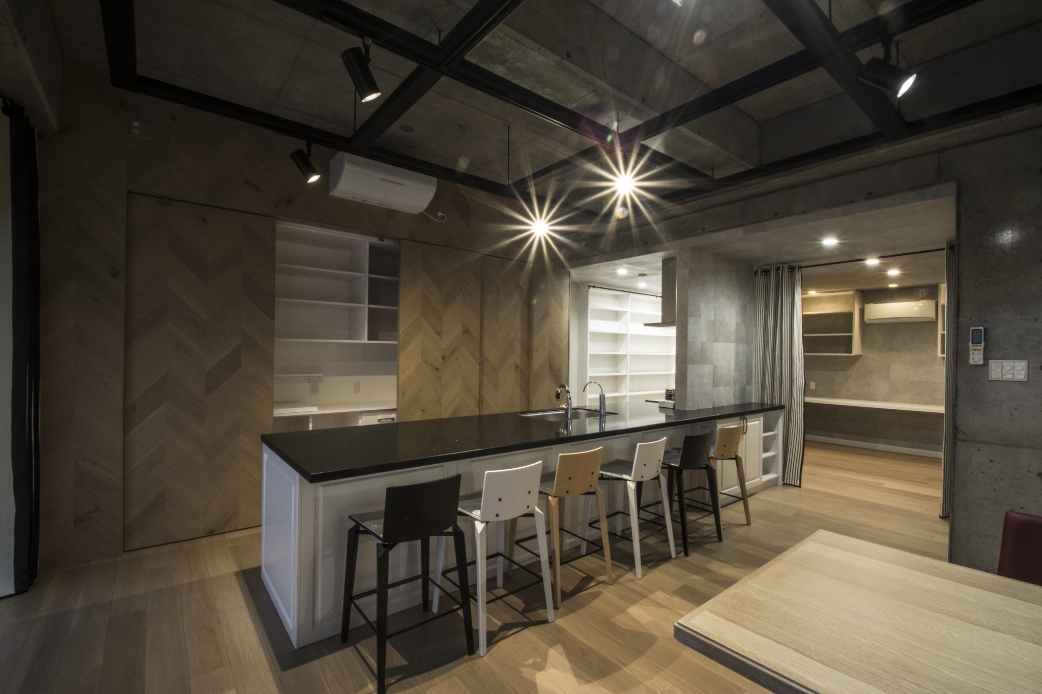 築30年のコンクリート打ちっぱなしのお家のリフォームのご依頼を受け、希望されたのはキッチン、バス、トイレおよび床を全面床暖をいれることなどでしたが、特にイメージのご希望とかはお任せいただく感じでした。ただ収納をとことん考えるということは初めからのご要望で、施主様の使い勝手やこうしたらどうかというご提案などがうまく混合してベストなものに出来上がったと自負しています。わたしはもともとお料理も大好きでいつもキッチンの動きやすさとか収納とかを考えています。自宅も3~4回以上新築や引っ越しリフォームでいろいろためし(とは言いながら今回のような大きなスペースがなかったのでいつも小さいスペースでなんとか収納もできて動きやすくてということを考えましたが)毎日の生活が快適で素敵でそして効率よく動けて、そしてすぐ取り出せるけれどすぐわかる位置にいろいろなものがあるにはどうしたらいいかと悩みます。ここではキッチンが4m60cmもあります。そして食洗機が2台パナソニックの引出タイプのものがご希望でした。自宅のキッチンも3m40cmありますがこれでも足りないぐらいで、ある本によればキッチンの長すぎるのもどうかということがありましたがスペースさえあれば5mぐらいあっても使いやすいなと思います。さらにこのような対面キッチンで反対側に座れるようにする場合には主婦は食べるときにも調理側にいて食事をします。そうすると足を入れるスペースがなければ快適に座れないのです。
