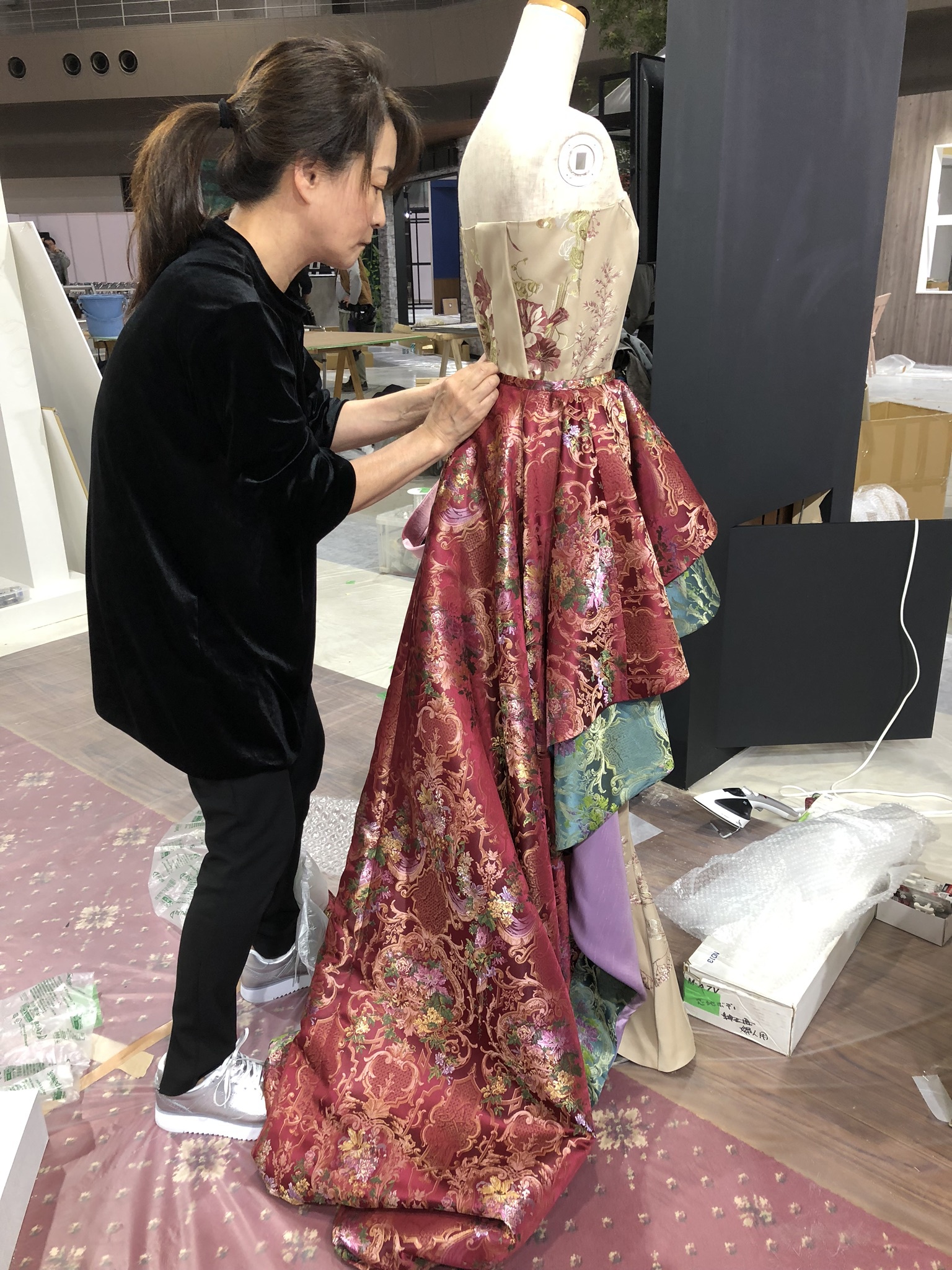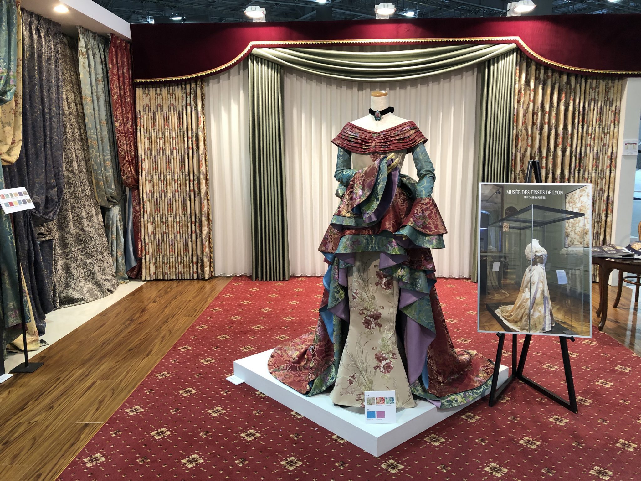 ジャパンテックスの東リのブースでカーテン生地を使ったドレスのデザインと縫製を依頼されました。このブースは東リのリヨン美術館シリーズを打ち出す企画でしたので、ドレスの生地はリヨン美術館シリーズです。リヨンは貴族文化華やかな時代、リヨンの職人たちがヨーロッパ中の宮廷からの注文にこたえるべく技を競い合い、歴史にのこるせいみつで美しい染織、手工芸の数々を残しました町です。東リのリヨンシリーズはリヨン美術館収蔵品の中から厳選した柄をカーテン生地にしたものです。この生地を使ったドレス、しかも現代にアレンジしたものということで、柄と柄の組み合わせとフリルのくみあわせ、そして中にはマーメイドスタイルのスッキリしたドレス。山崎が型紙もとらず立体裁断でこんなステキに出来上がりました。レトロっぽくって戻ってきたら着てみたい人いるかな