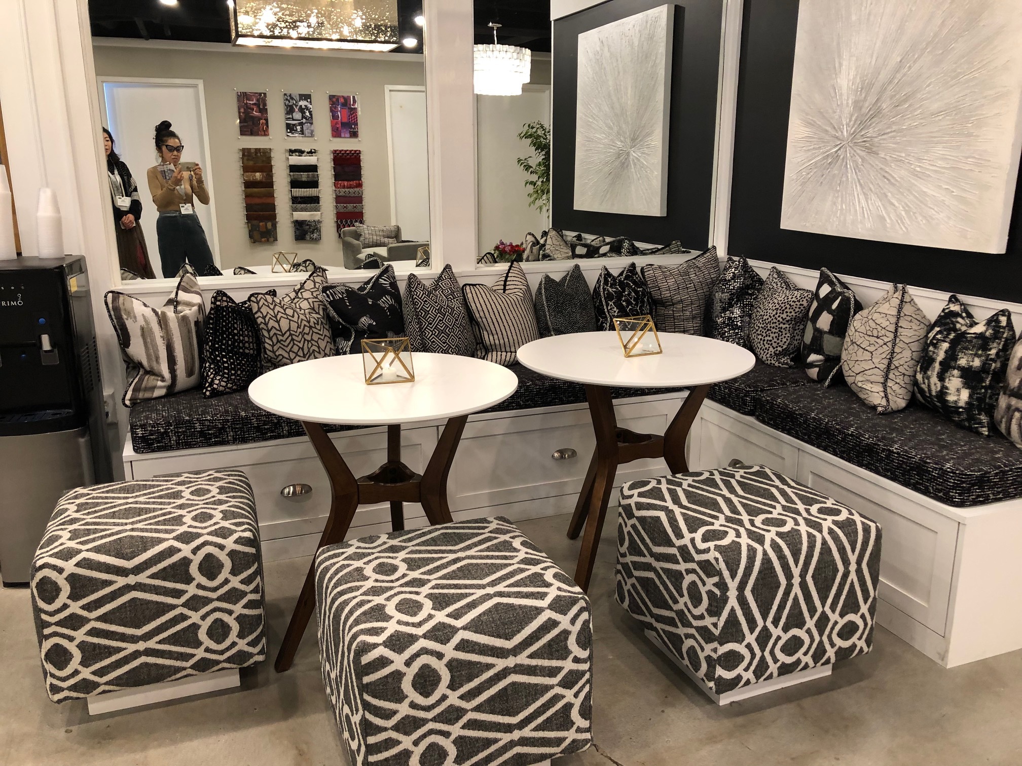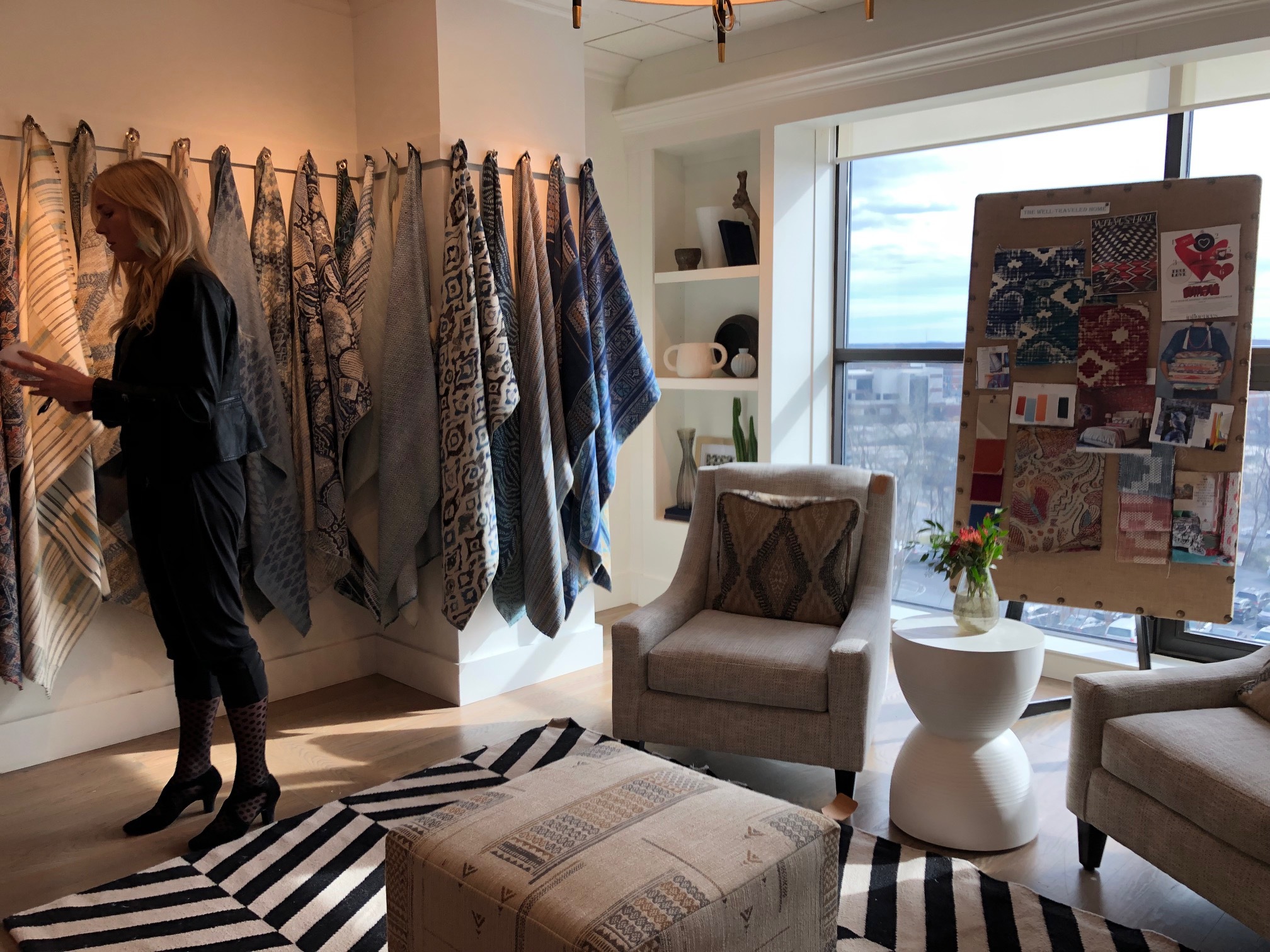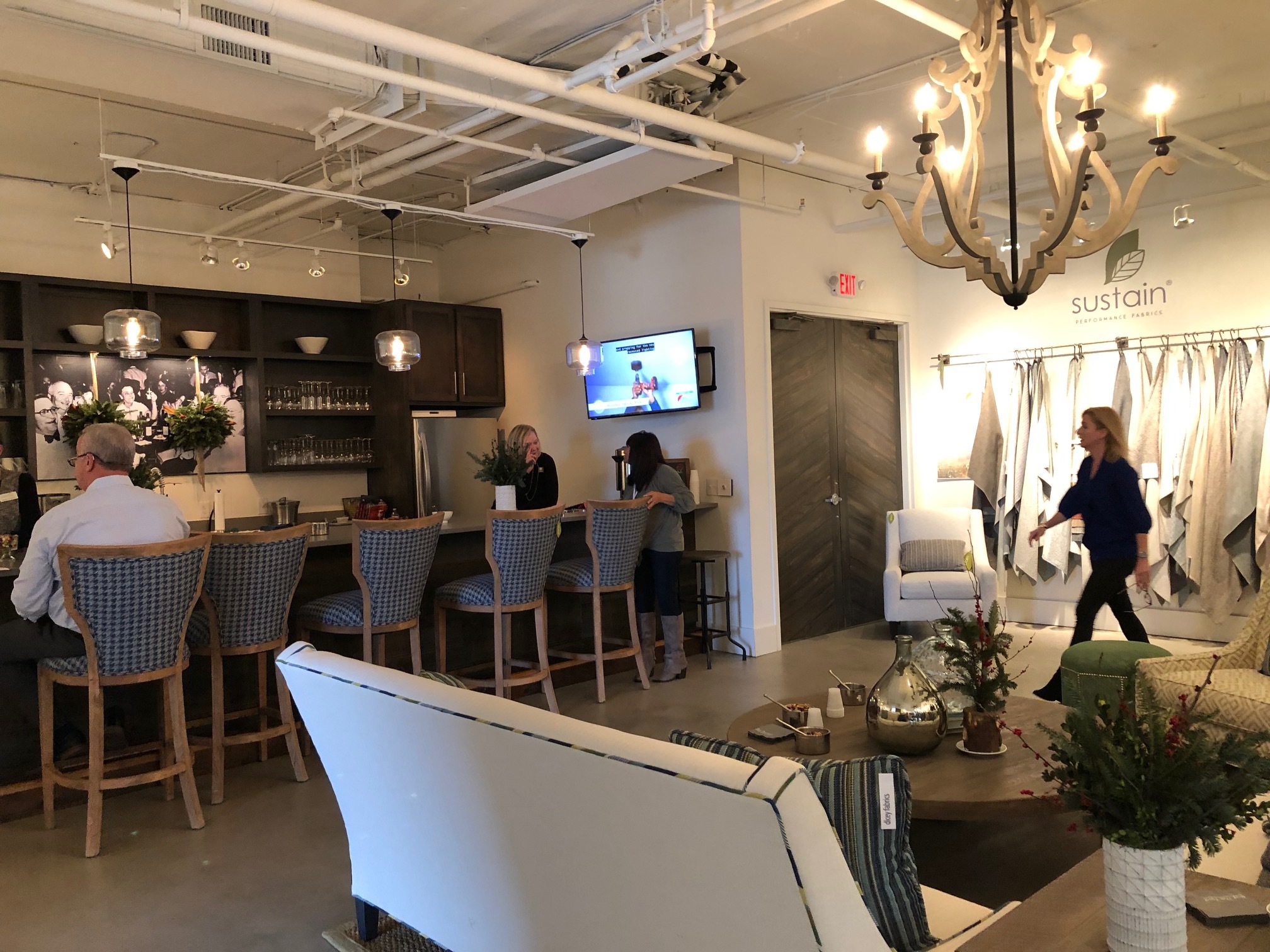 朝やお昼の時間は朝食がでたり、夕方からはワインなどもでてちょっとしたパーティのようになります。アメリカで製造しているところはこのテキスタイルビルディングの近くに広大な工場があるところばかりで、デザインから糸の染色を含め織り機で完成し出荷するまで一貫してやっている会社は自社のスタイルや会社に誇りを持って働いていて、デザイナーも営業もすべての人たちが接客しています。テキスタイルにかかわっている人たちの楽しそうな様子はバイヤーにとっても大きな刺激なると思います。クッションのファブリック使いを見ているだけでも、アメリカのインテリアはやっぱり大好きです。