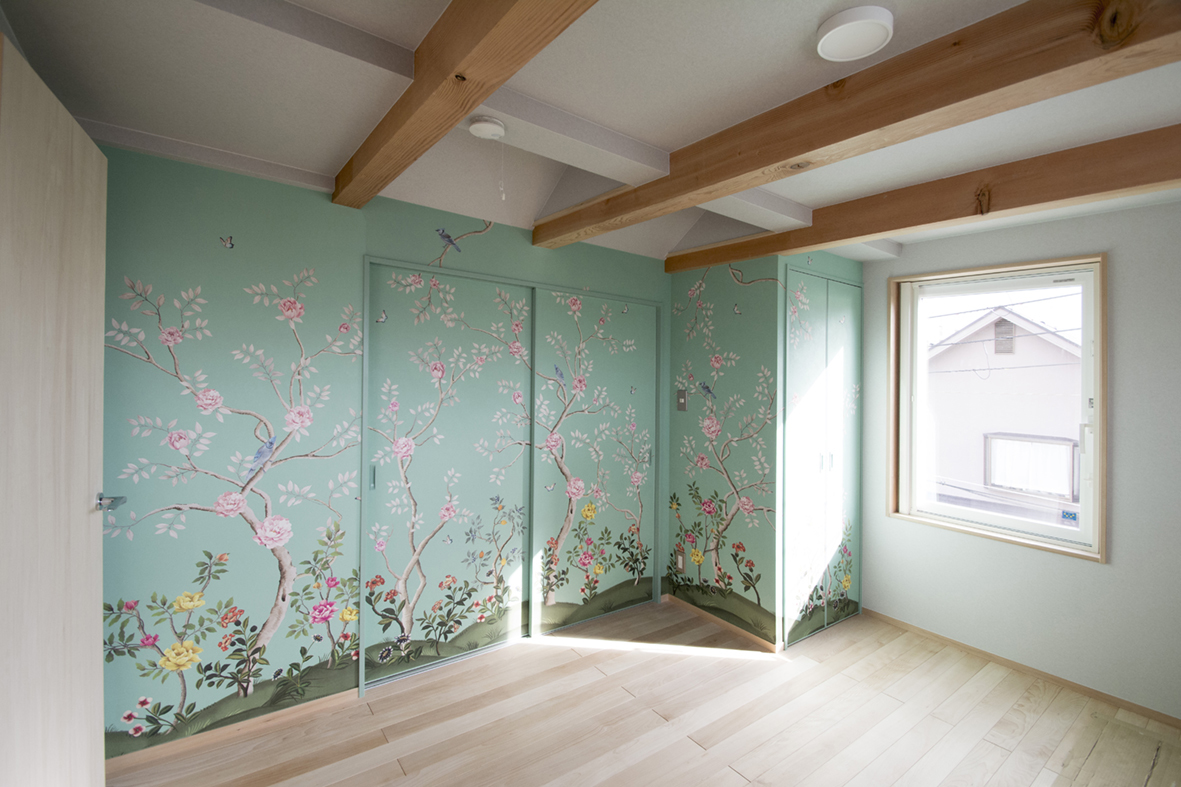 お嬢様のお部屋に壁一面にシノアの壁紙をさせて頂きました。とても個性的なカラーをご希望頂き、それを使いこなすセンスと若さをお持ちで、どの様に住みこなされるか楽しみです。収納の扉も連続して画像製作していくので、扉枠や隙間など細かい寸法出しや依頼を設計の方や建具屋さん、壁紙施工の方など気持ちよく仕事をしていただきました。