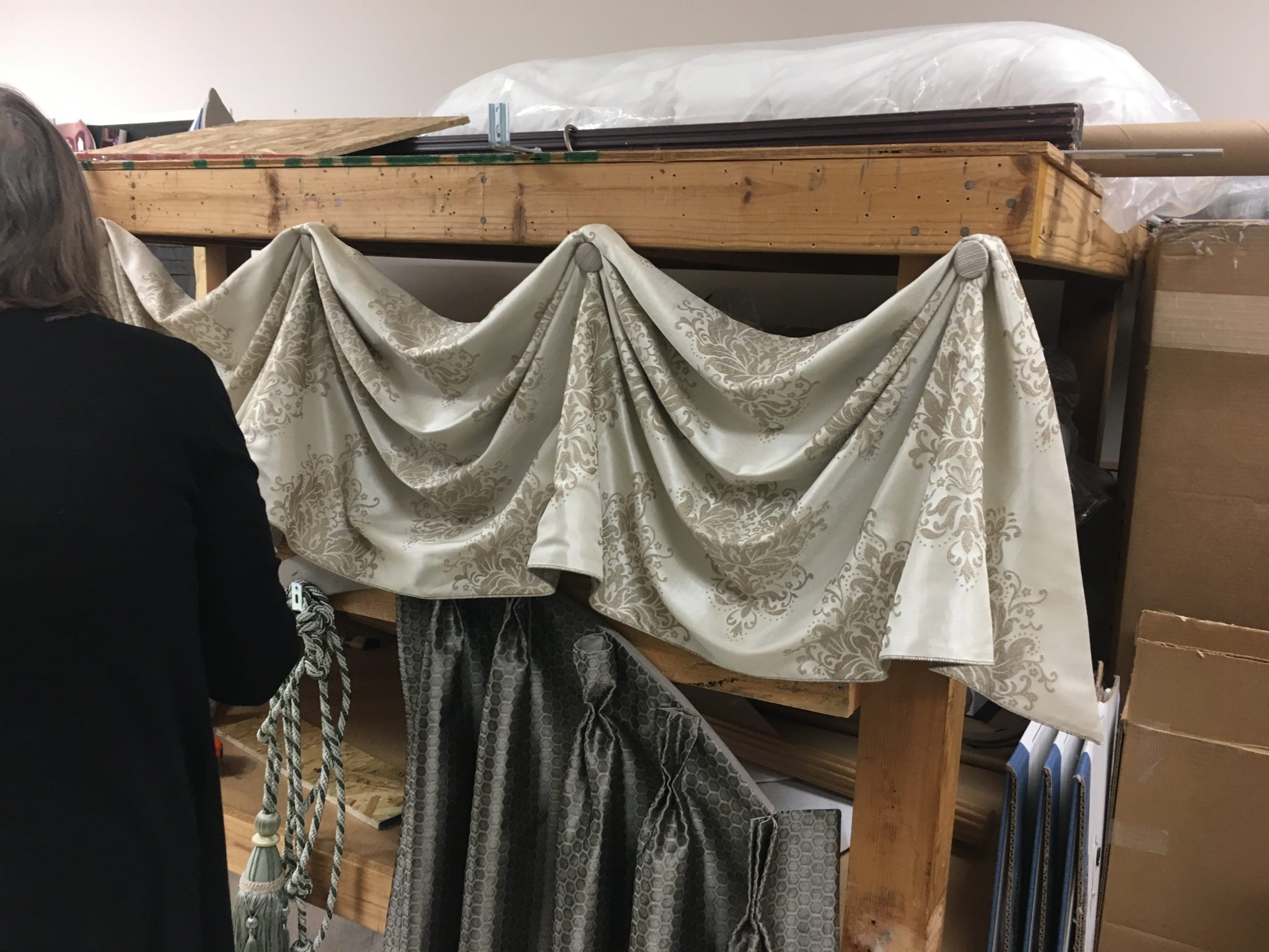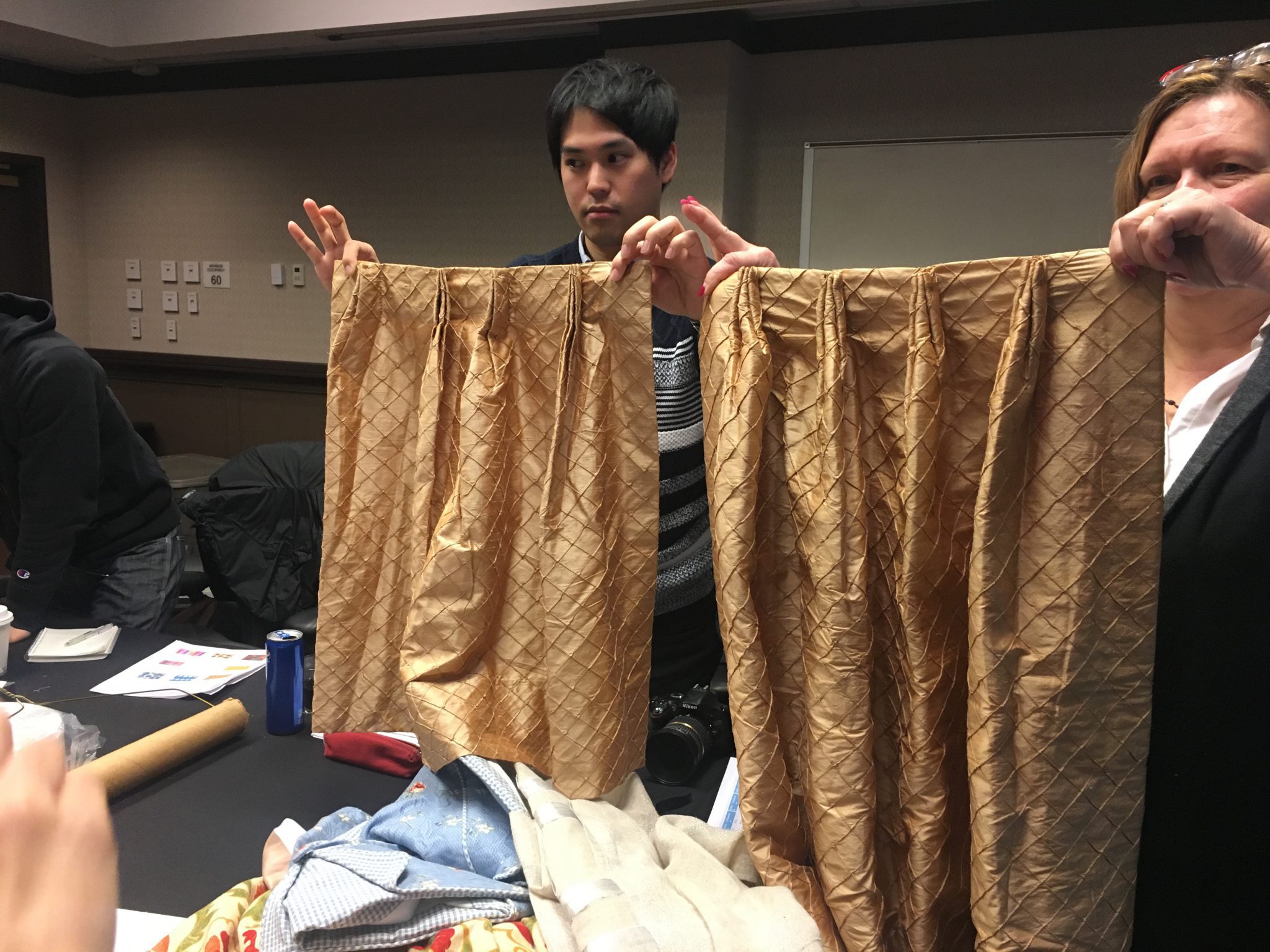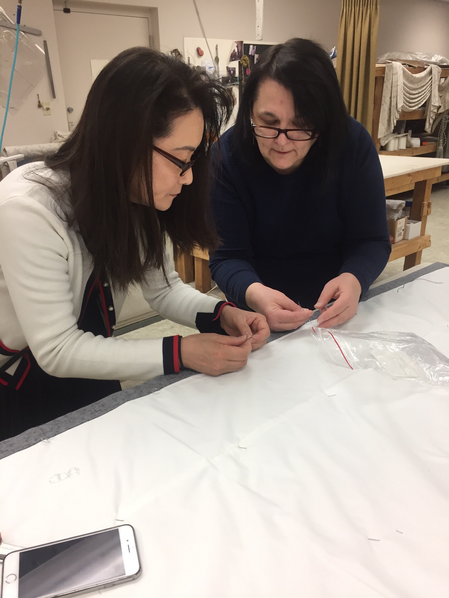 その都度疑問に答えて頂き、またとても丁寧に材料も揃えて頂き至れり尽くせりで感謝、感謝の3時間でした。アメリカと日本とでは、歴史文化の違いで中々思う様にはいけませんが改めて手仕事の大切さを感じ私自身いつかは誰にも真似が出来ない位の手間暇を掛けた物作りをしたいと思いました。また何時も思うのですがアメリカの方々は、とても親切にオープンに惜しみ無く御指導をして下さるのに感銘致します。お休みの中レッスンをして下さったDorapery Sorceの方々に感謝致します。有難うございました。