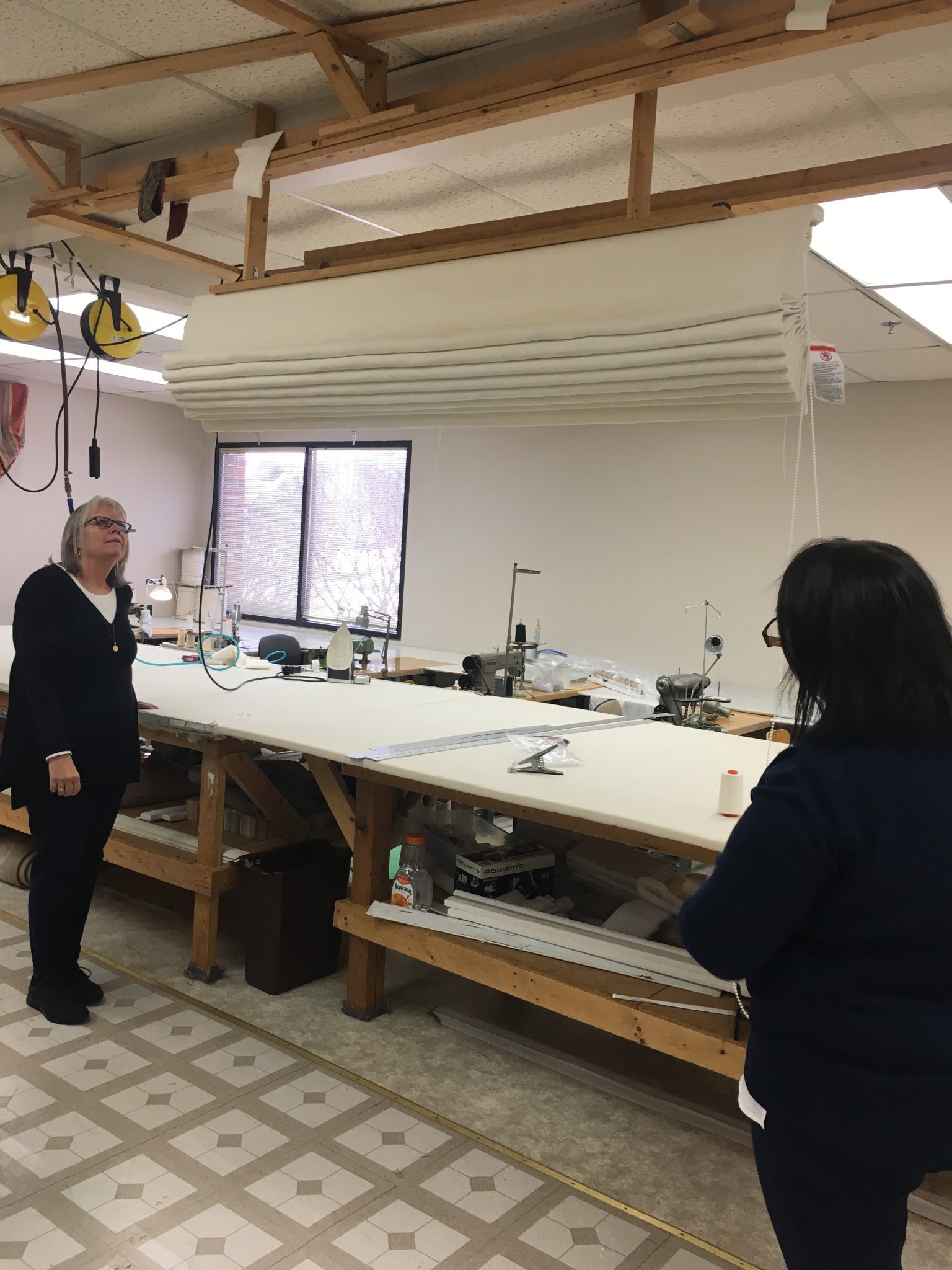 プライベートレッスンの場所はthe Drapery Souceというworkroom(工場)で総数11名程の方達で稼働されている、工場といってもアトリエ的な丁寧な手仕事をされている所でした。さすが広大なアメリカ、workroomも充分な広さ高さ(私にとってこの高さが羨ましい!)でした。まずはシャープシェードの製作。ある程度縫製して頂いていてポイントとなるリングの手縫い(これも驚き!一つ一つ手で縫い付けます。(縫い目が表に出ない事で仕立の良さがとてもわかります。)
