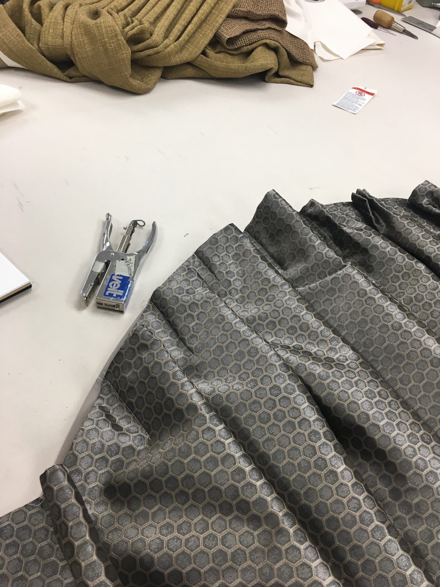 引き続きヘッドの高さが20cm弱の一つ山ドレープカーテンの製作。リサブレアでは日本では手に入らない物は独自で輸入をしています。今回使用した芯も日本にはないのでこちらも入手しようと思っています。