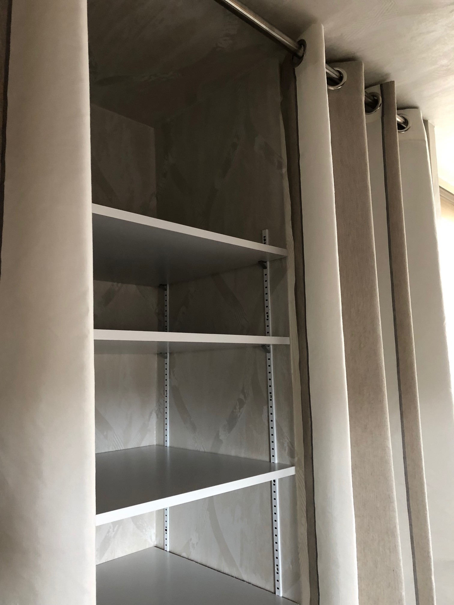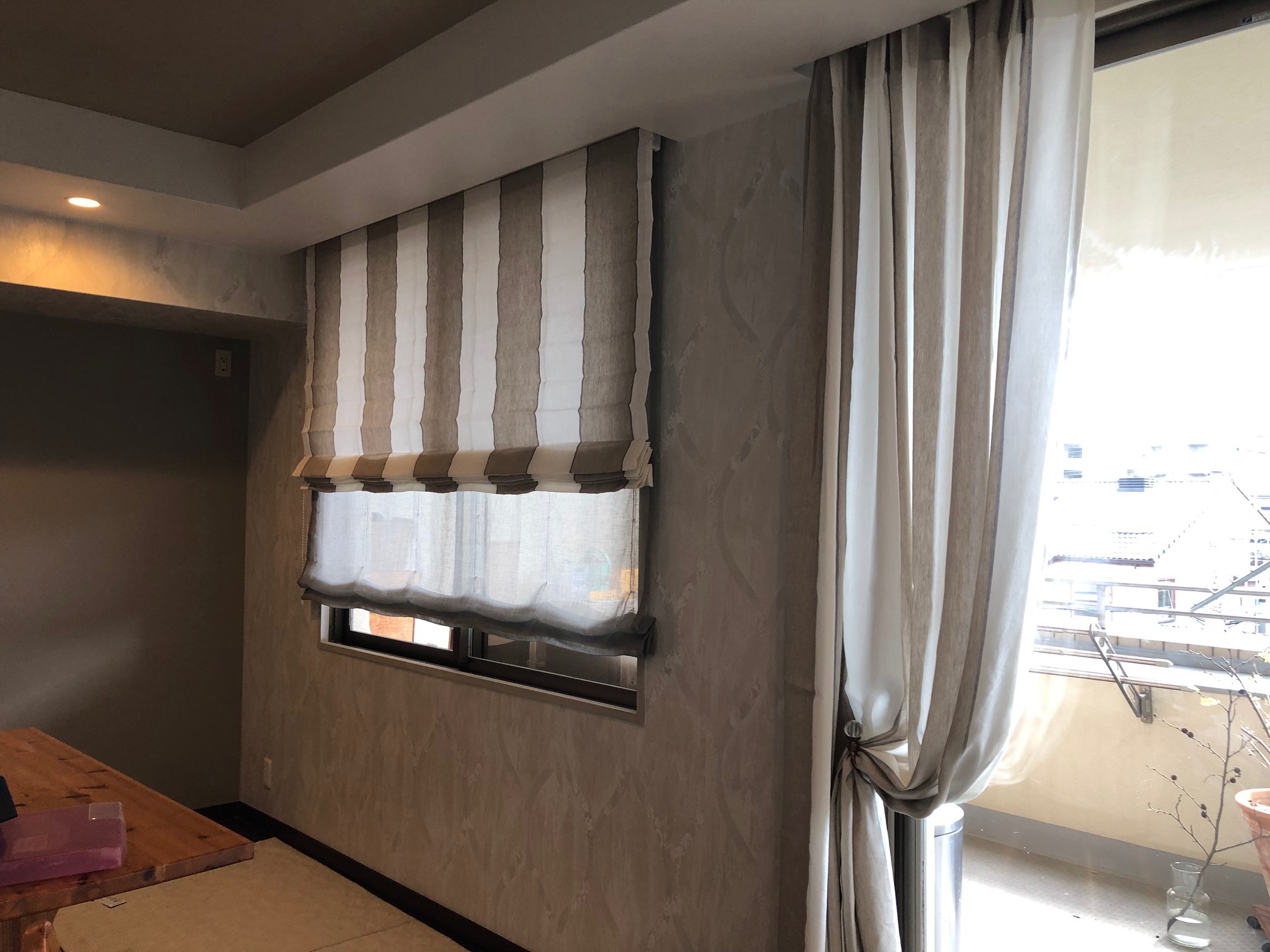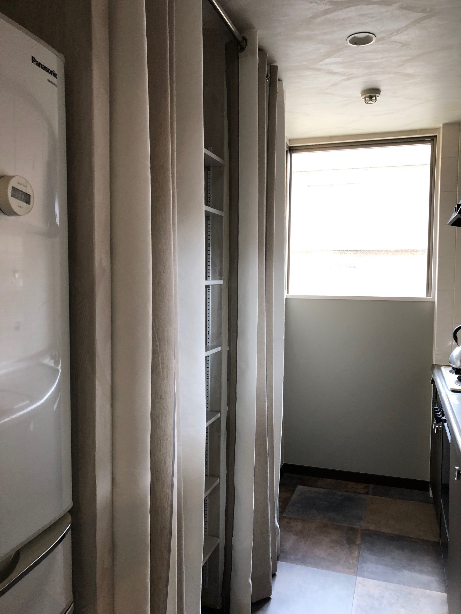 こちらは写真をとったときが工事のすぐ後だったので一部の写真しかないのが残念ですが、すべてがそろうとお写真をいただける予定です。ご相談は壁紙や照明、家具のリフォーム方法、収納、カーテンなどです。マンションですが天井高が高くて張りが多かったのですが、むしろこの張という欠点を長所に変えて、太いモールディングのように見せる工夫で、天井面に濃い色をご提案しました。イメージとパインの家具(ダイニングセットとキャビネット)が合わないからどうするかということで、大変かもしれませんがご自分で塗装していただくことになりました。キッチンはいつも収納が問題。そこで冷蔵庫横に壁をつくり中はすべて可動の棚にしてはと目カーテンをつけました。はと目カーテンはこういう時には最強の味方です。汚れたら選択したらいいし、カーテンを変えると気分も変わります。