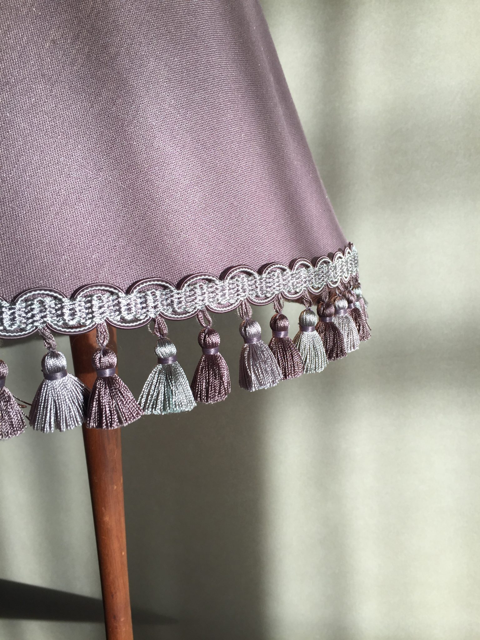 クッションはカーテンと同じ生地で作り、お客様がお持ちだったアンティークのランプシェードも生地の張り替えて上下にDEKOMA のフリンジをつけました。