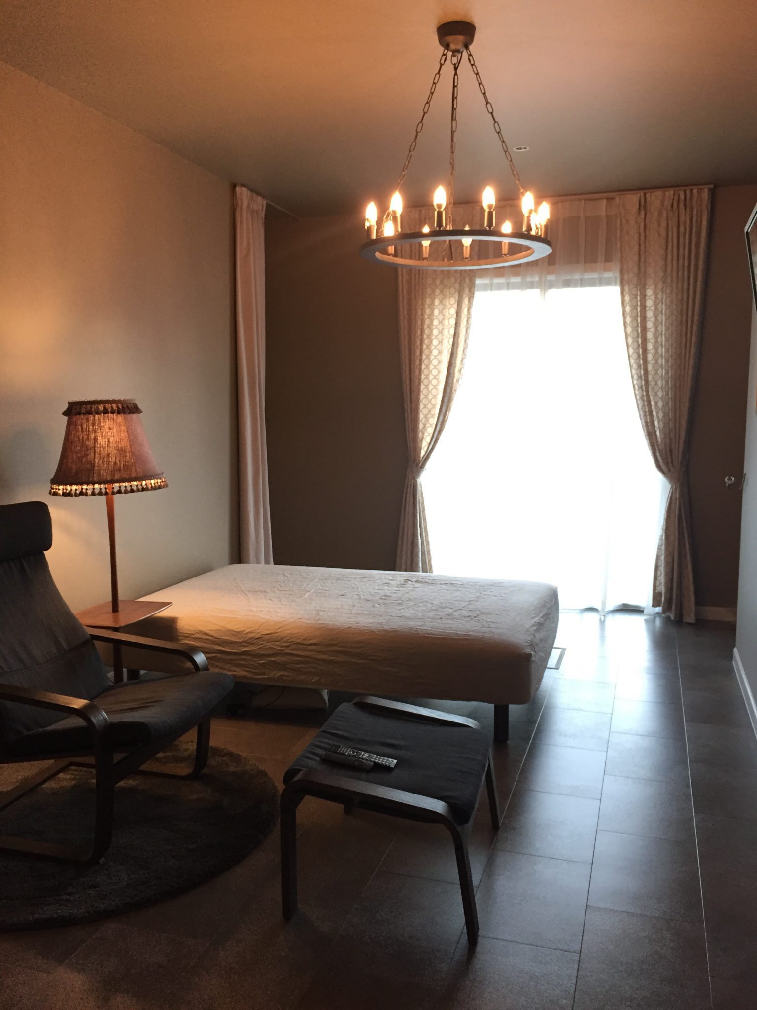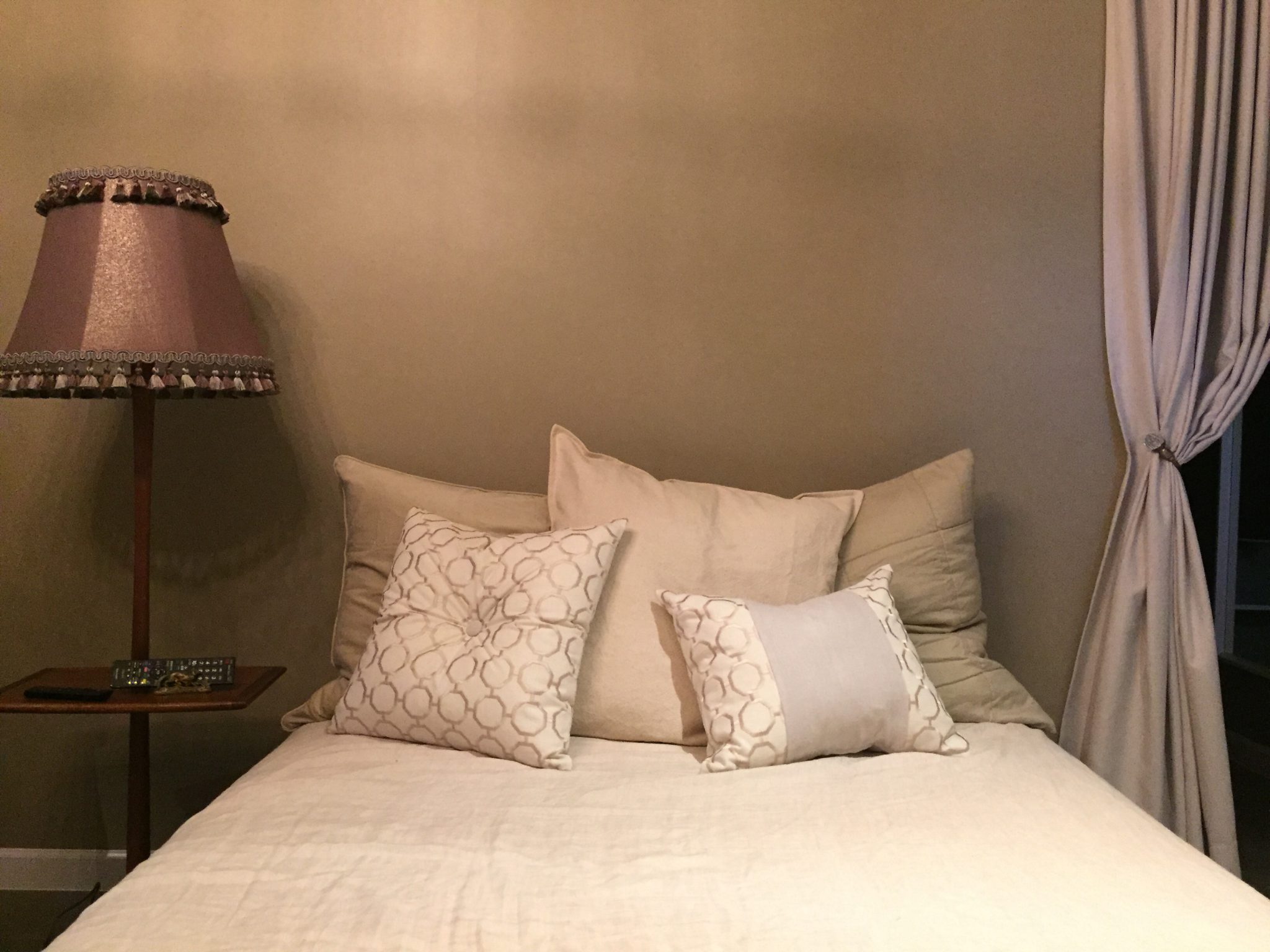 壁はグレージュ、床はグレーの塩ビタイル、落ち着いた雰囲気のシンプルなベッドルームです。天井の高さが270センチと一般の戸建て住宅の高さより30センチ高いのでとても広いベッドルームでした。今回納品させていただいたのは、ソフトファニシング(カーテン、クッション、ランプシェード)です。カーテンは全て天井から取り付けました。生地はイギリスのブランドC&Cです。