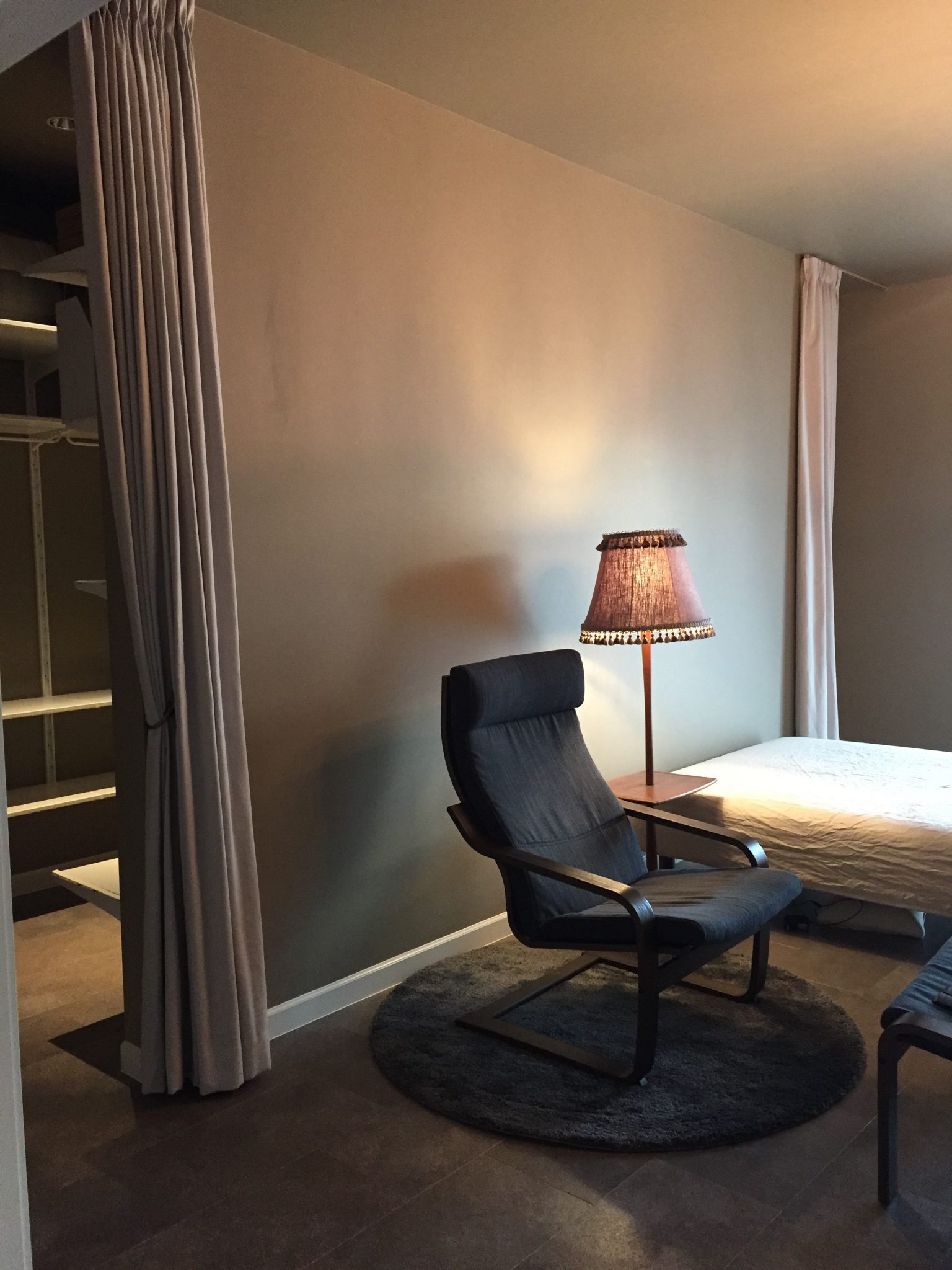 写真のように通路にもカーテンを取り付けました。この壁の向こうは大容量のクローゼットになっています。カーテンで仕切ると出入りも便利だし取り替えも可能、写真では分かりにくいですがスタックバック(カーテンを引っ掛ける金具)がついているので、カーテンを弛ませてスタイリングによって雰囲気を変える事もできます!