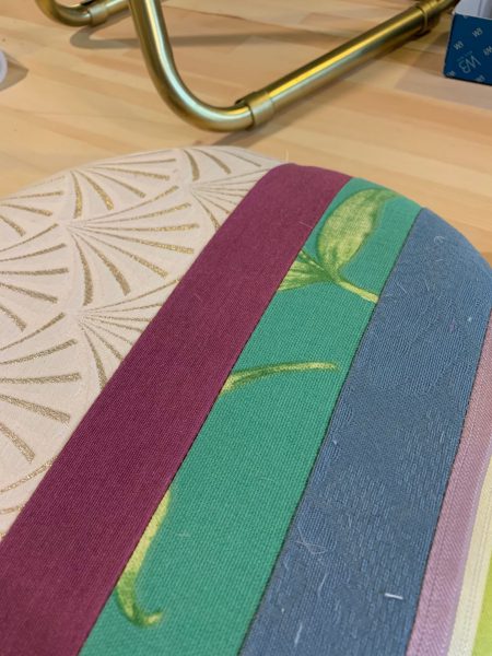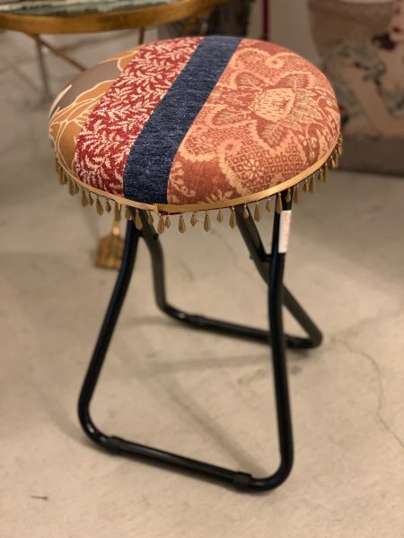 市販の折りたたみスツールの座面をご自身で好みの生地に張り替える作業ですが、まずは生地選びから始まります。