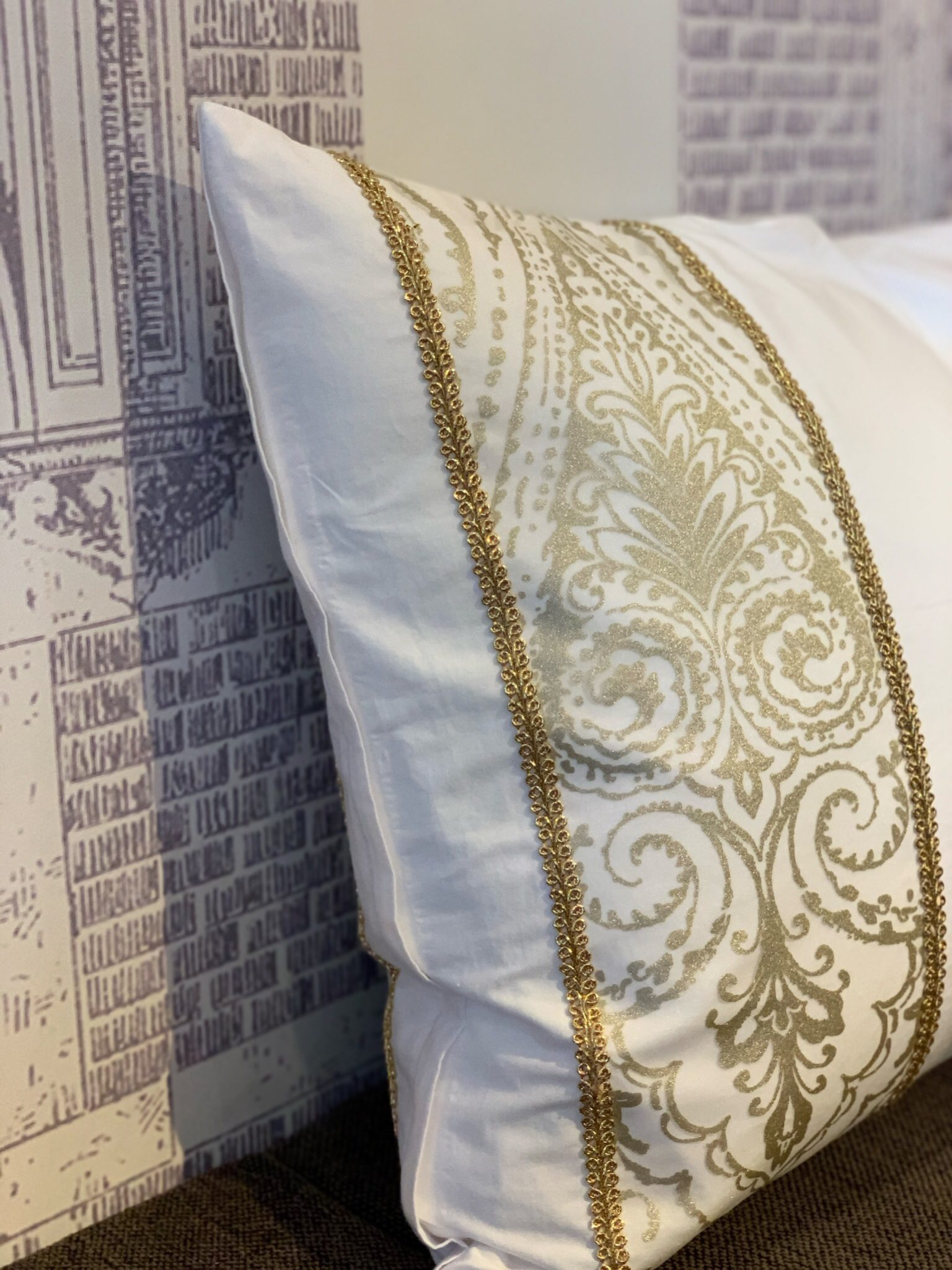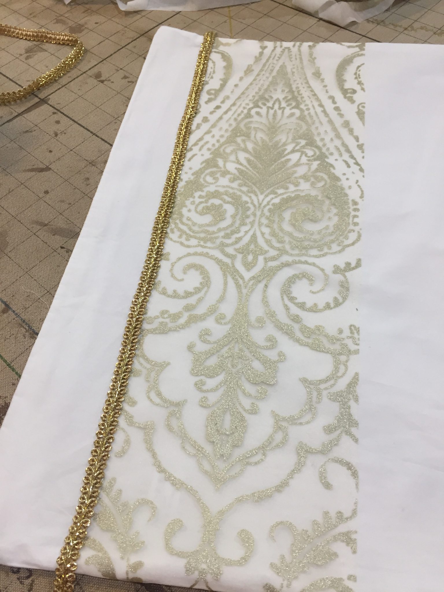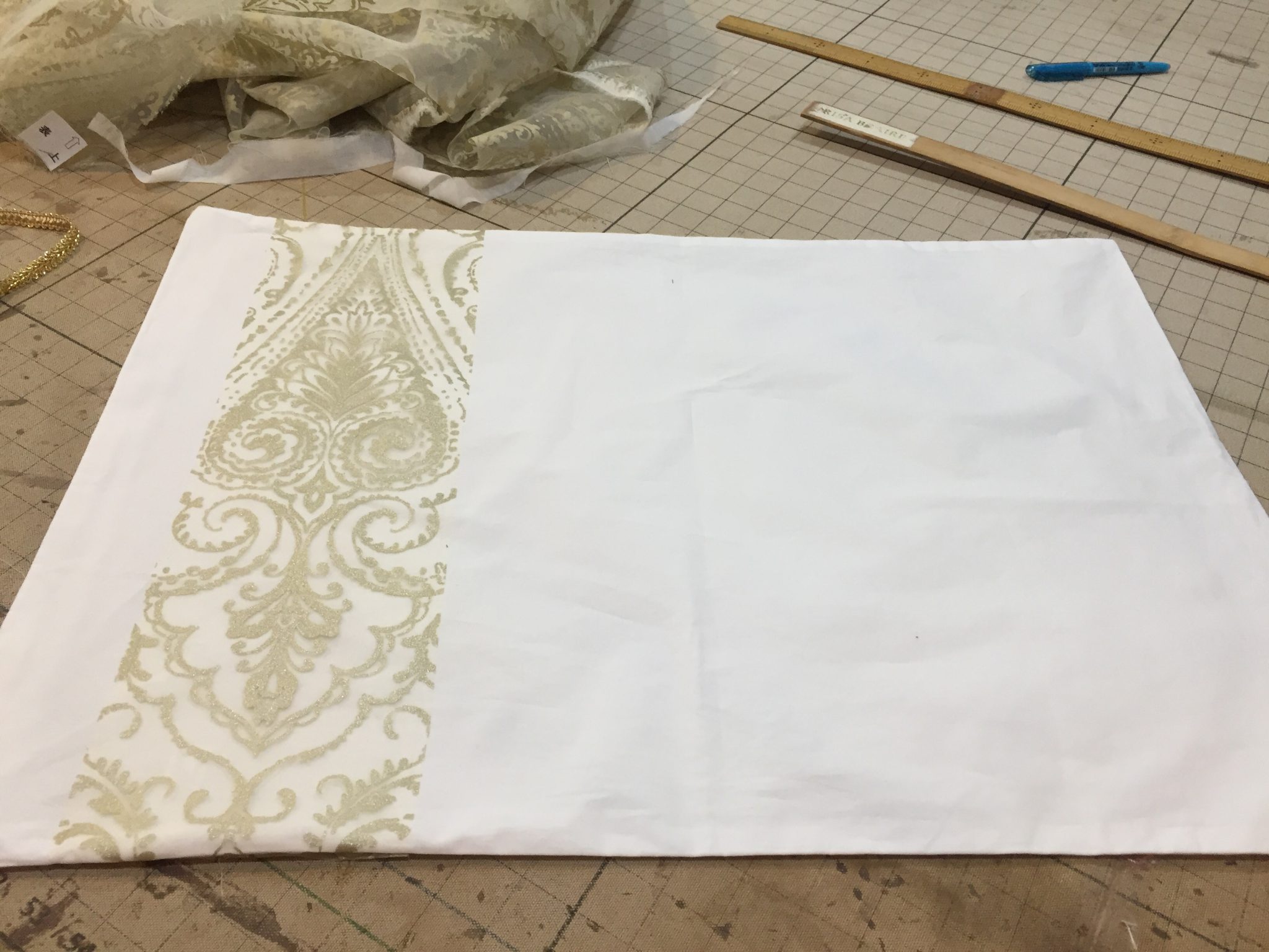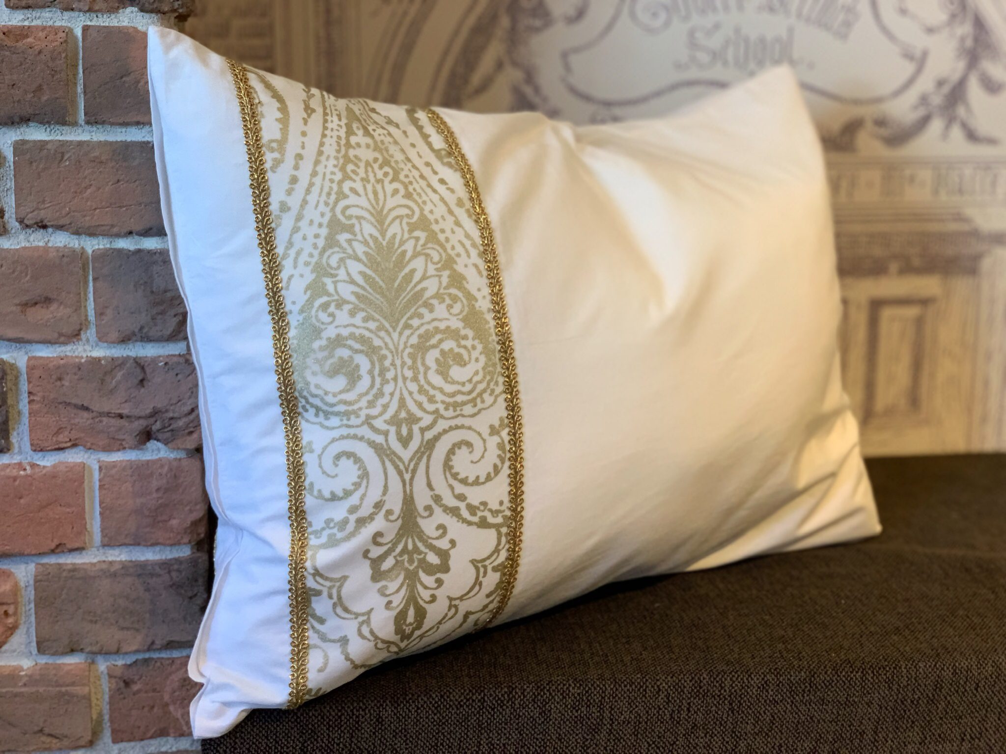 先日オーダーいただいたピローケースをご紹介したいと思います。こちらはお客様の画像を元に縫製したものです。『こんなピローケースを探しています』とご来店され最初は似たような柄が無いかサンプル帳を探していたのですがなかなか見つからず、代表の石川のアイデアで似た柄のレースカーテンを縫い付けたらどうかな。という事で写真に近い柄のレースとゴールドのコードを探し 本体の白いピローケースはお客様が買ってきます!と言われ数時間後に購入されたピローケースを持って来られました。