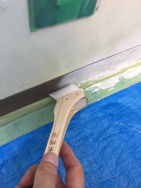 ローラーでは塗りにくい狭い場所や窓枠等は、あらかじめはけで塗っていきます。