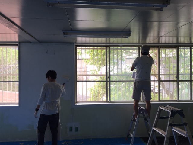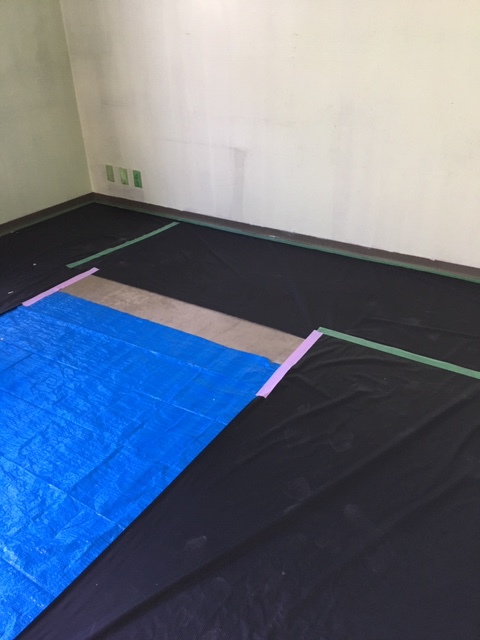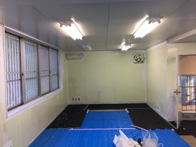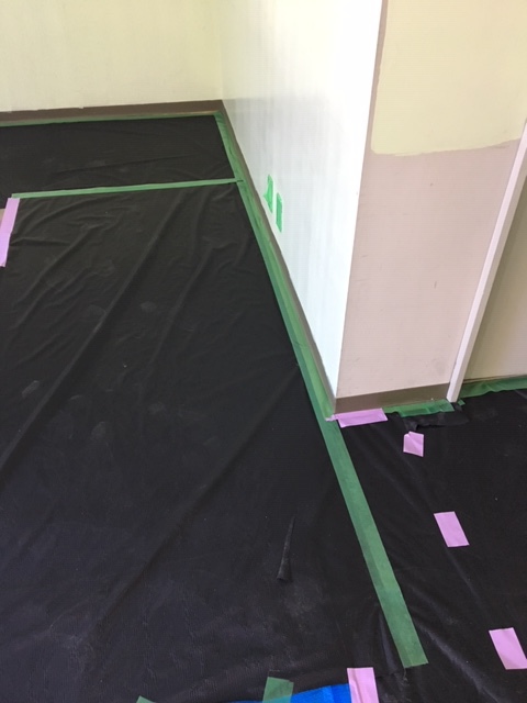 まずは、グリーンの壁をホワイトに塗装します。塗装前に養生していきます。