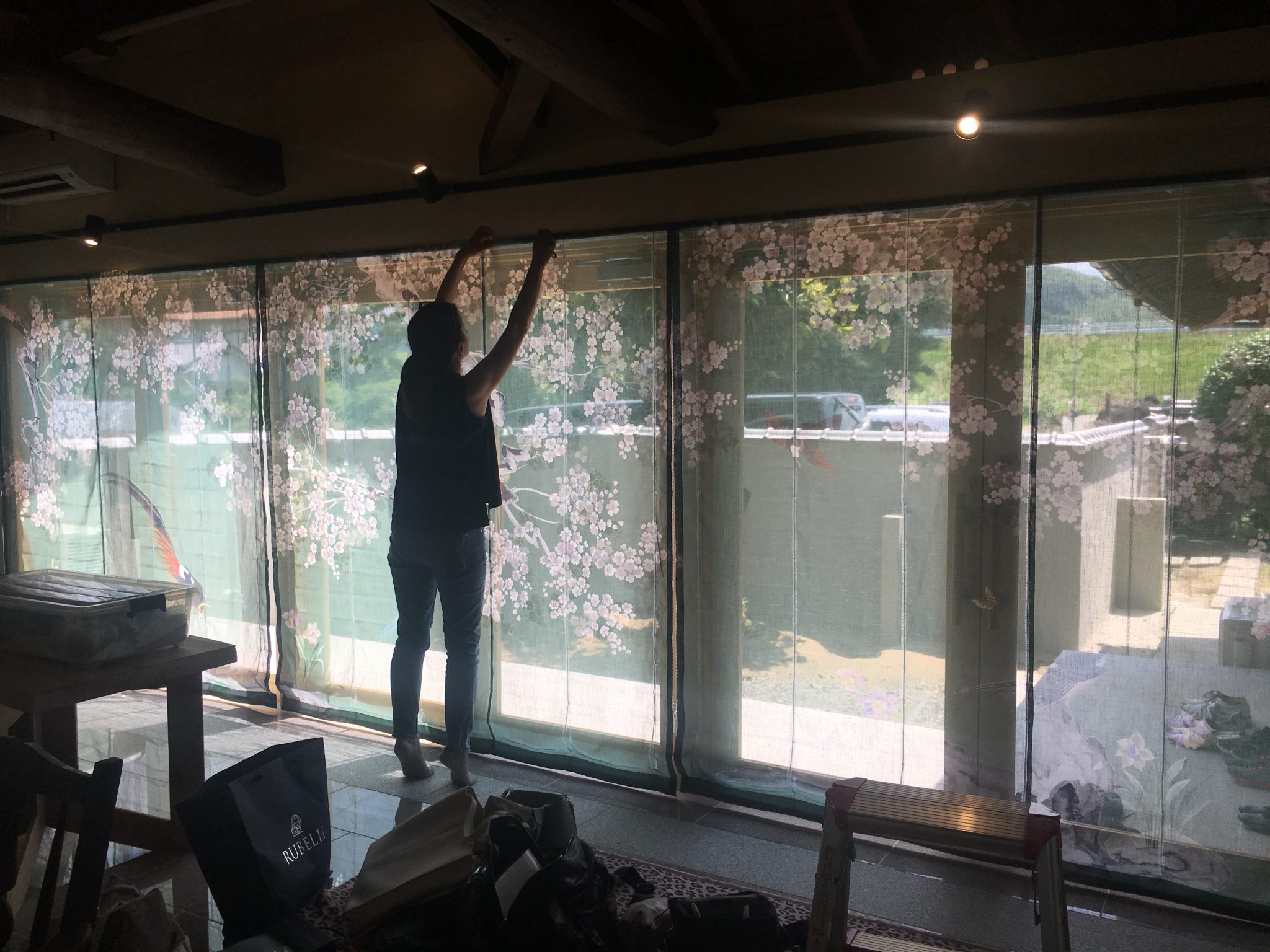縫製担当の山崎が仕上げの確認をしている様子。全体のデザインは分かりにくいですが、桜が咲き誇る圧巻の窓になりました。
