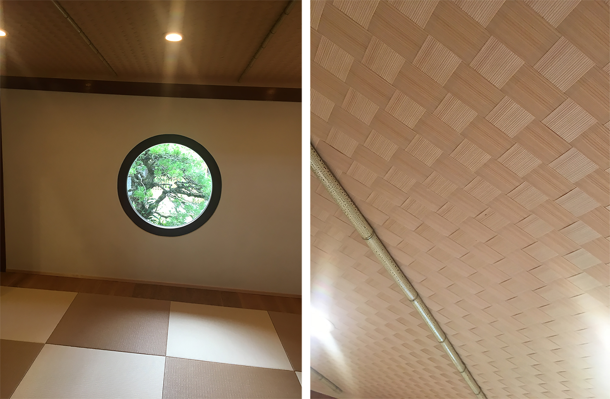 こんな小窓もありました。松の木が丸い窓から、まるで切り取られたかのように見えています。そして(恐らく)杉で編んだ天井、それを支える竹。至る所に気を配る日本人の美意識を感じ、日本人であることの誇りを感じます。