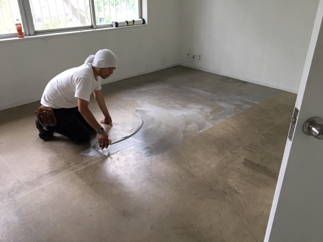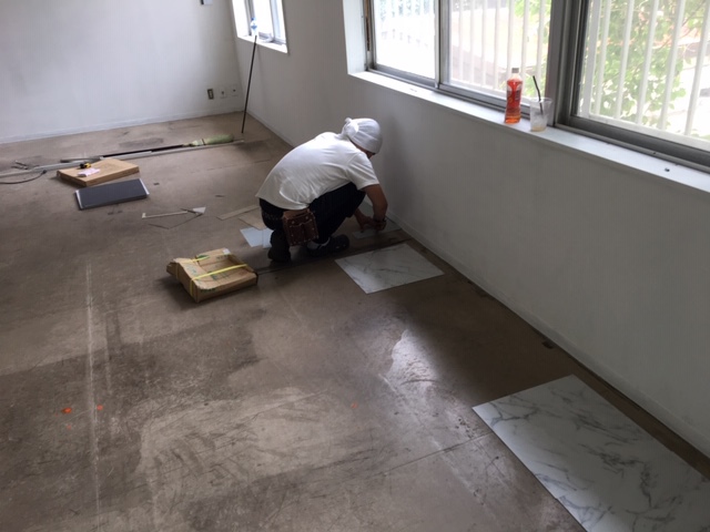 古い床材が浮いている箇所を切り込み、剥がしてから、レベルをフラットにする為に下地用としてタイルを