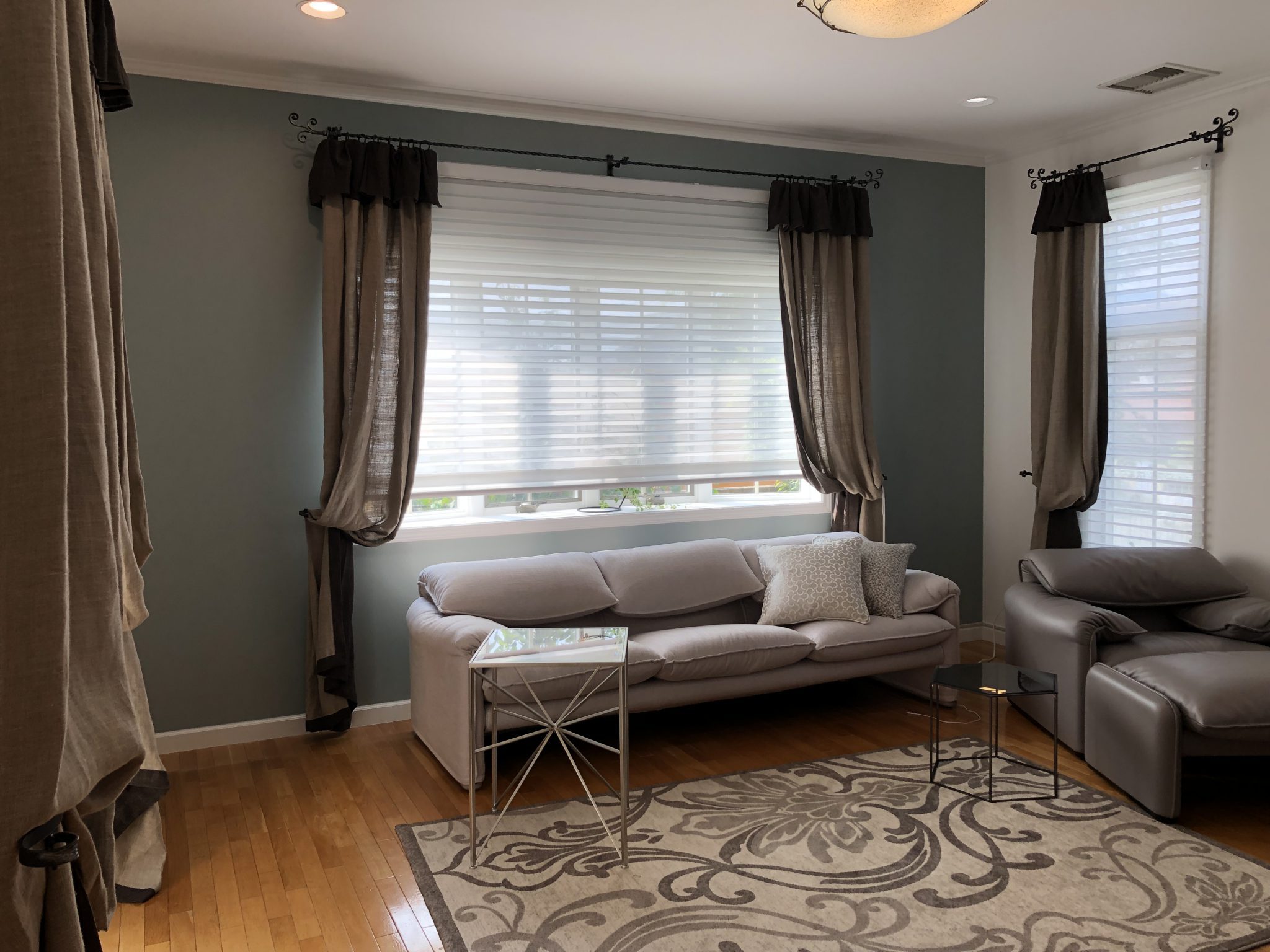 カーテンもぐっと変わってシェードと飾りカーテン、しかもリバーシブルがいけるリネンのカーテンをしていただきました。表裏色が違うのでチラミエがアクセントになり、襟つきのデザインにさせていただきました。
