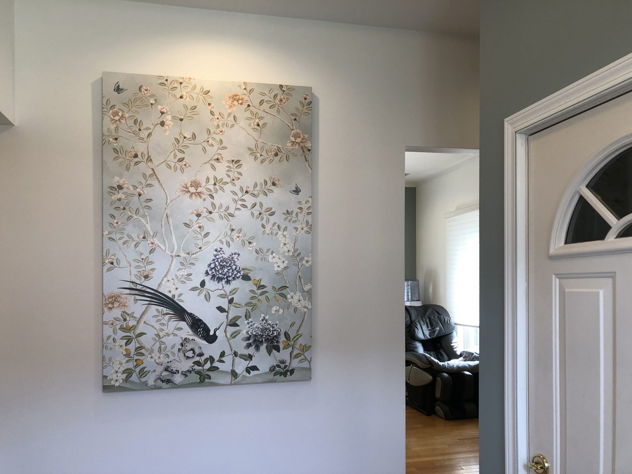 約20年前にインテリアコーディネートをさせていただいたお客様からご依頼があり壁紙カーテン、シノアパネルをさせていただきました。あの頃はデコラティブなインテリアが流行っていて、しかも輸入住宅の場合、壁紙はイエローやアイボリーが多かったのですが、時代も変わり最近はグレー系やグレーベージュ系、バニラ系が流行っています。壁紙は色を入れたり柄を入れたりするとアクセントになってインテリアがまとまりやすくなるのですが、なかなか一人では勇気がいるようです。でもこの施主様はブルーを選んでいただきました。そのブルーに合わせて他はピュアホワイト、しかもペイント仕上げのようなマットでフラットな仕上げです。こうした壁紙は施工が難しいのですが、少しのエクストラの料金できれいにはることができます。