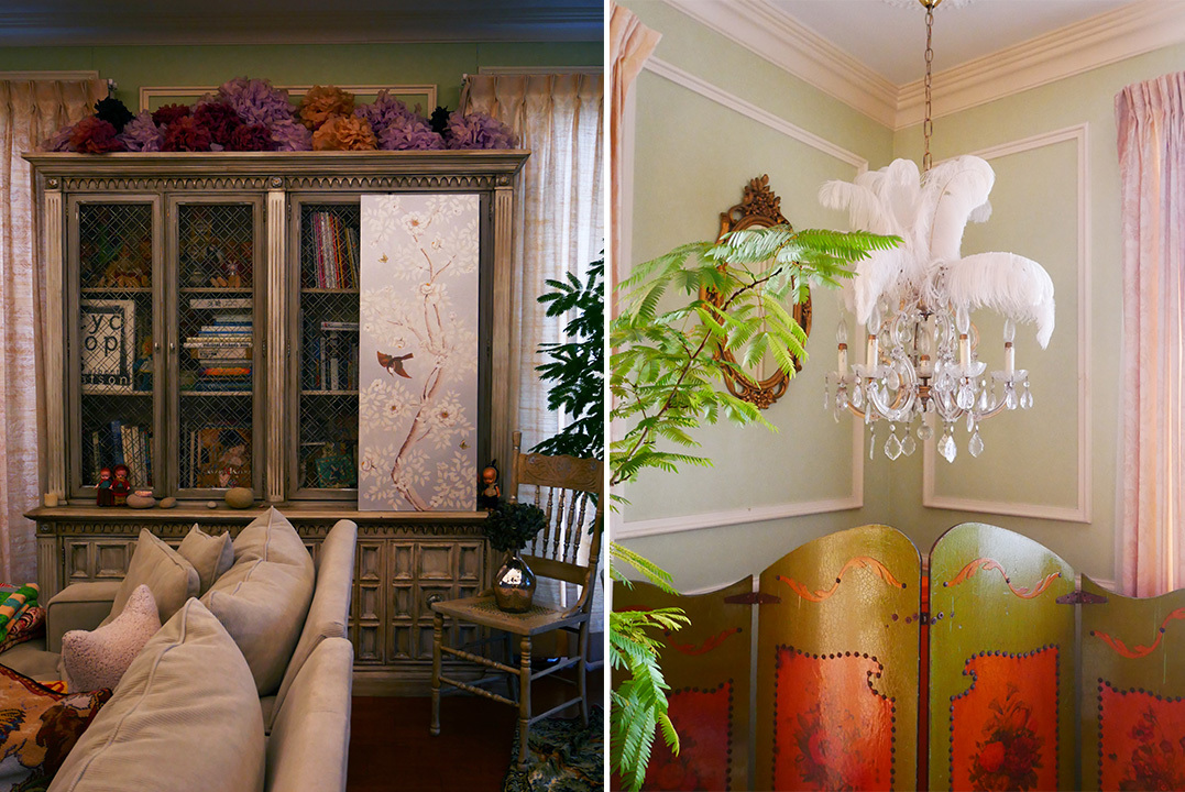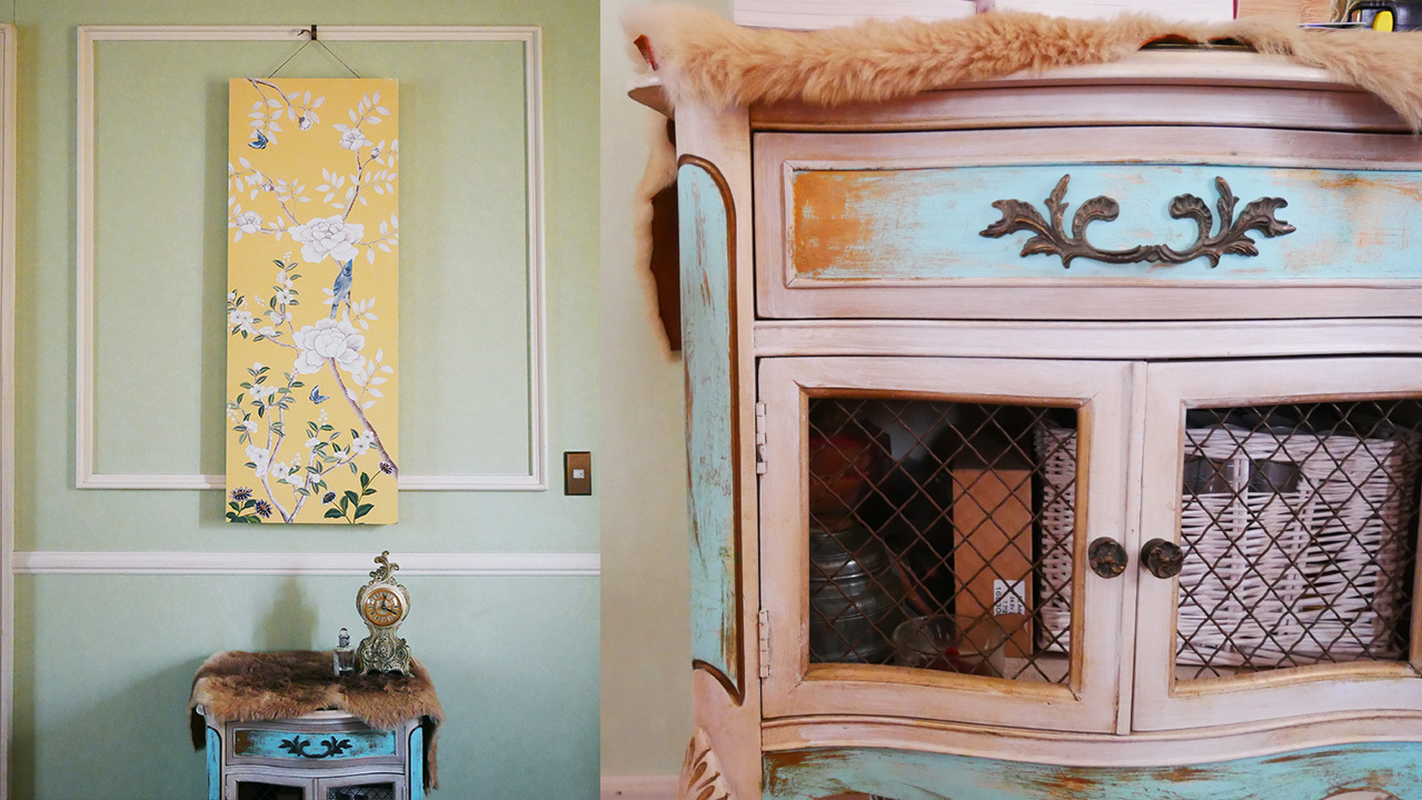 左の写真のキャビネットはアメリカンサイズ!これもアンティークですがこの存在感が何とも素敵。年月を経て徐々にペンキが色褪せて絶妙な色に変化しています。シノワズリのパネルがパール調で光っており、新旧の素材の対比がとても面白く撮影中に色んな気付きがありました。