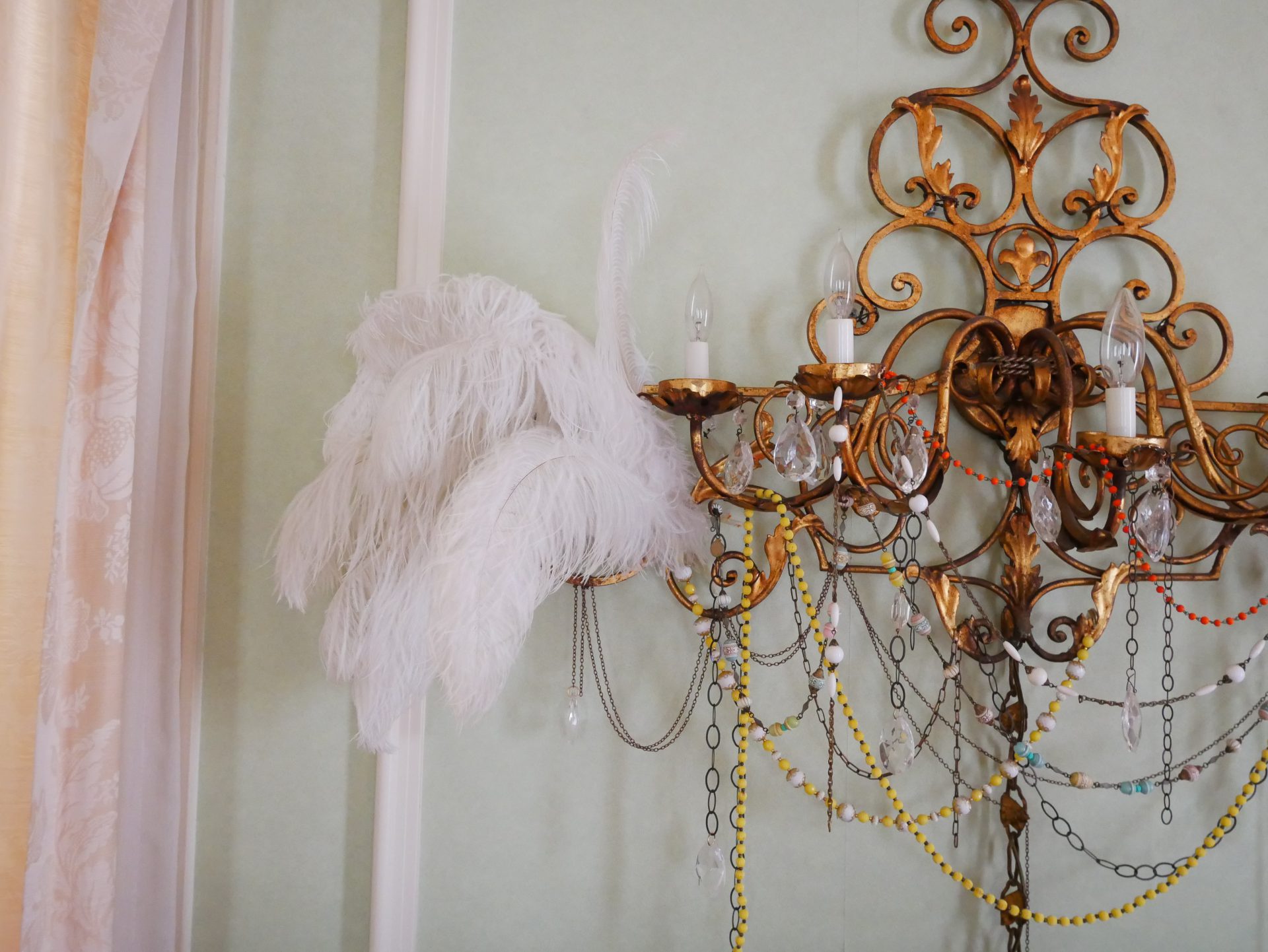 右は私のお気に入りスポット。シャンデリアに羽が付いており、まるでマリーアントワネットの世界の様な優雅さ。