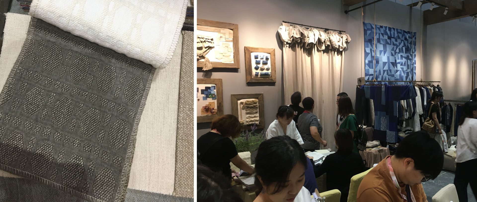 左はリネン生地メーカー。デザイナーである40代の女性がおり、大学生の娘さんに通訳してもらいました。麻のインディゴ染めのファッションブランドから始まり、近年インテリアファブリックを展開し始めたとの事。天然素材に拘り、織りや色展開の豊富さに見惚れてしまいました。