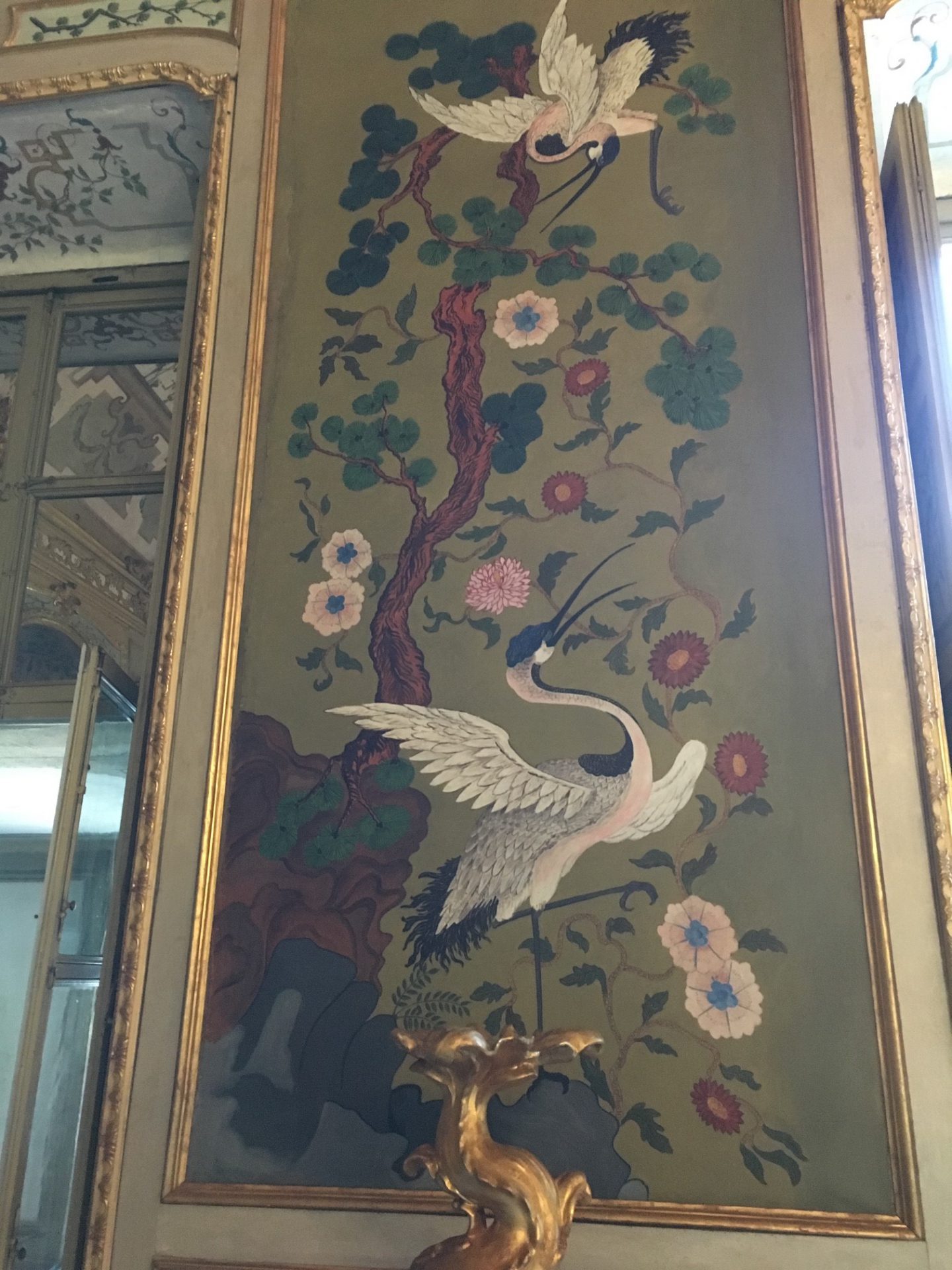 モールディングの中に施された美しいパネル。躍動的な鶴と、松や菊など日本の影響が大きいのではないかと思われる作品。西洋独特の可愛らしいお花があるのがシノワズリの魅力。