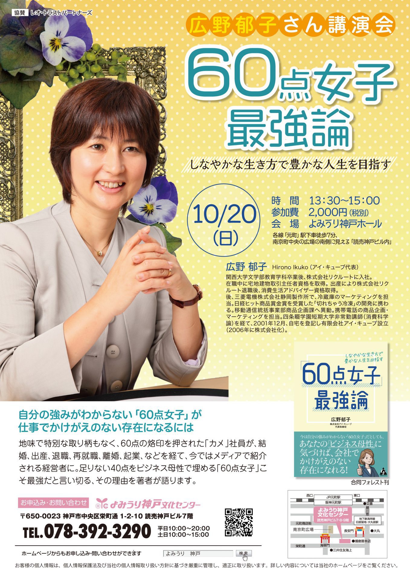 広野さんが執筆された「60点女子」最強論のなかでも強調されていた「ビジネス母性」。なるほど、本当にビジネス母性のある方なんです。この本を読んで広野さんが自分はダメだダメだと悩みながらも頑張ってこられた経過が面白くも頼もしくもあります。若いころは皆そうなんですよね。キャリアに悩んでいる方などとても勇気ずけられる本です。こんな広野さんの講演会のお知らせです。実際にお話すればいろんなヒントが得られますよ。是非ご参加ください。直接、よみうり神戸文化センターにお申し込み頂いても結構ですし、リサブレアにご連絡いただいても結構です。