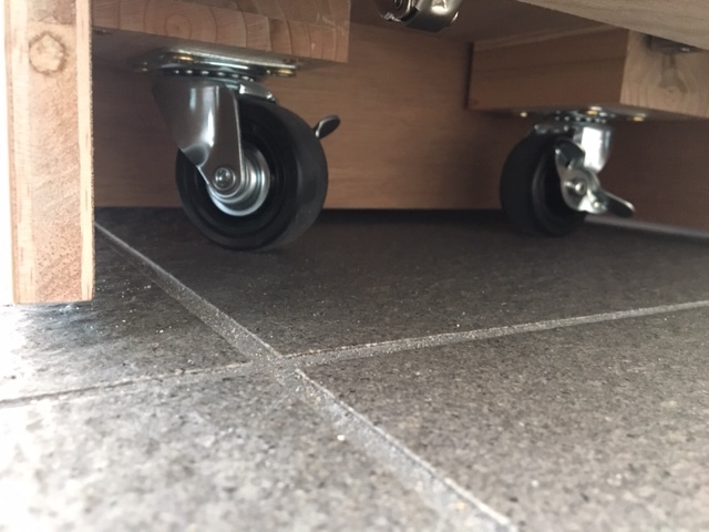 コンソール下部の幕板の側面を開くように設計し、前後のキャスターをロックできます。