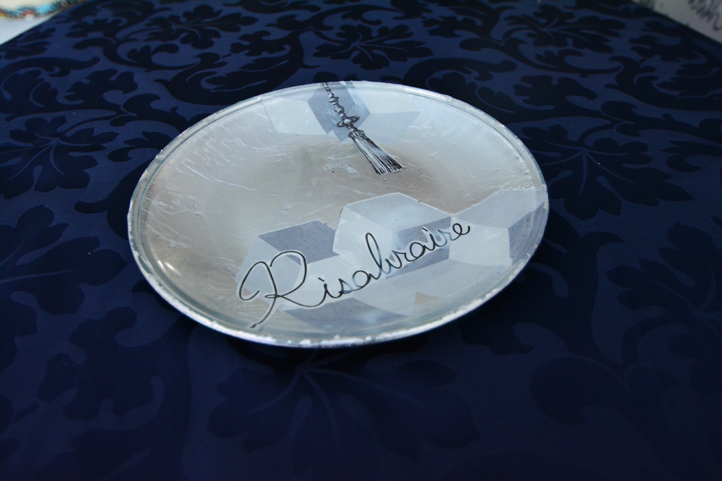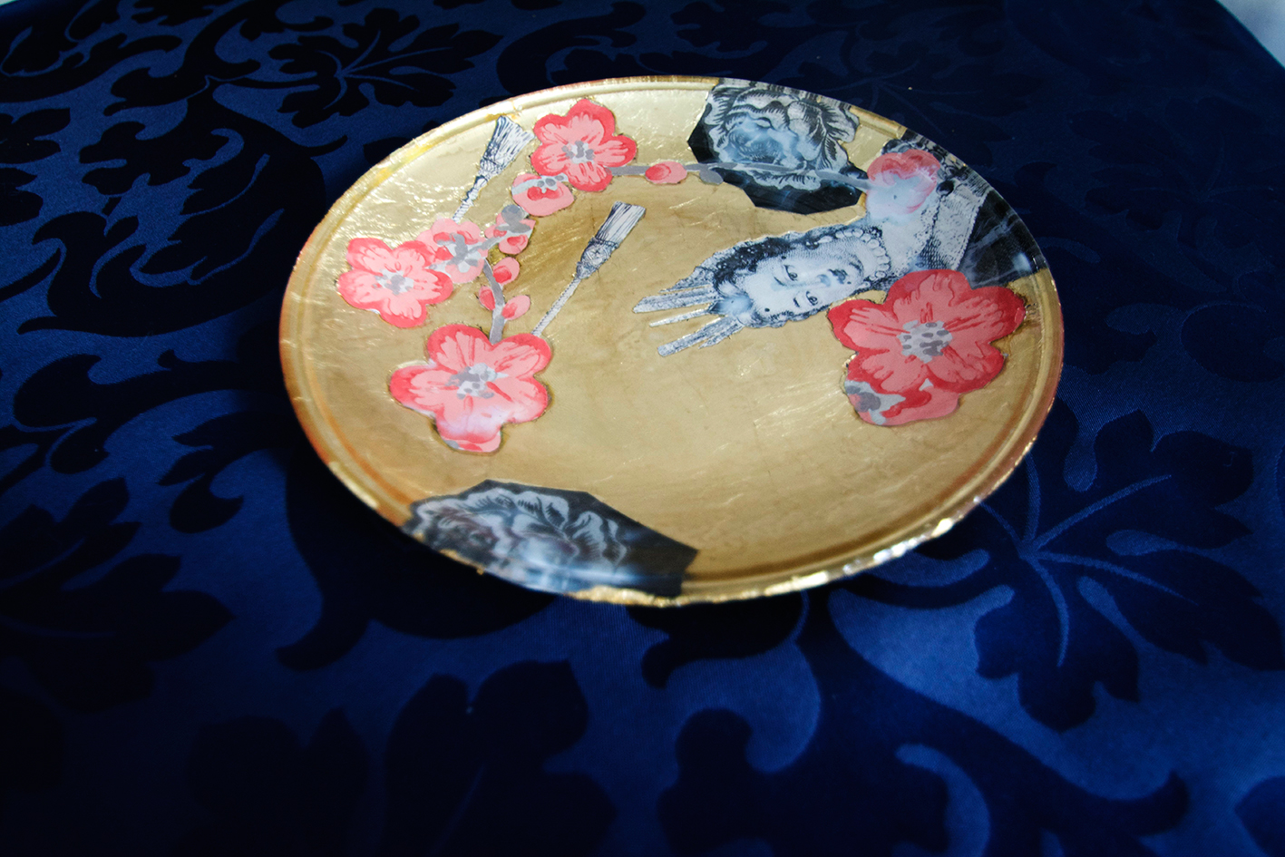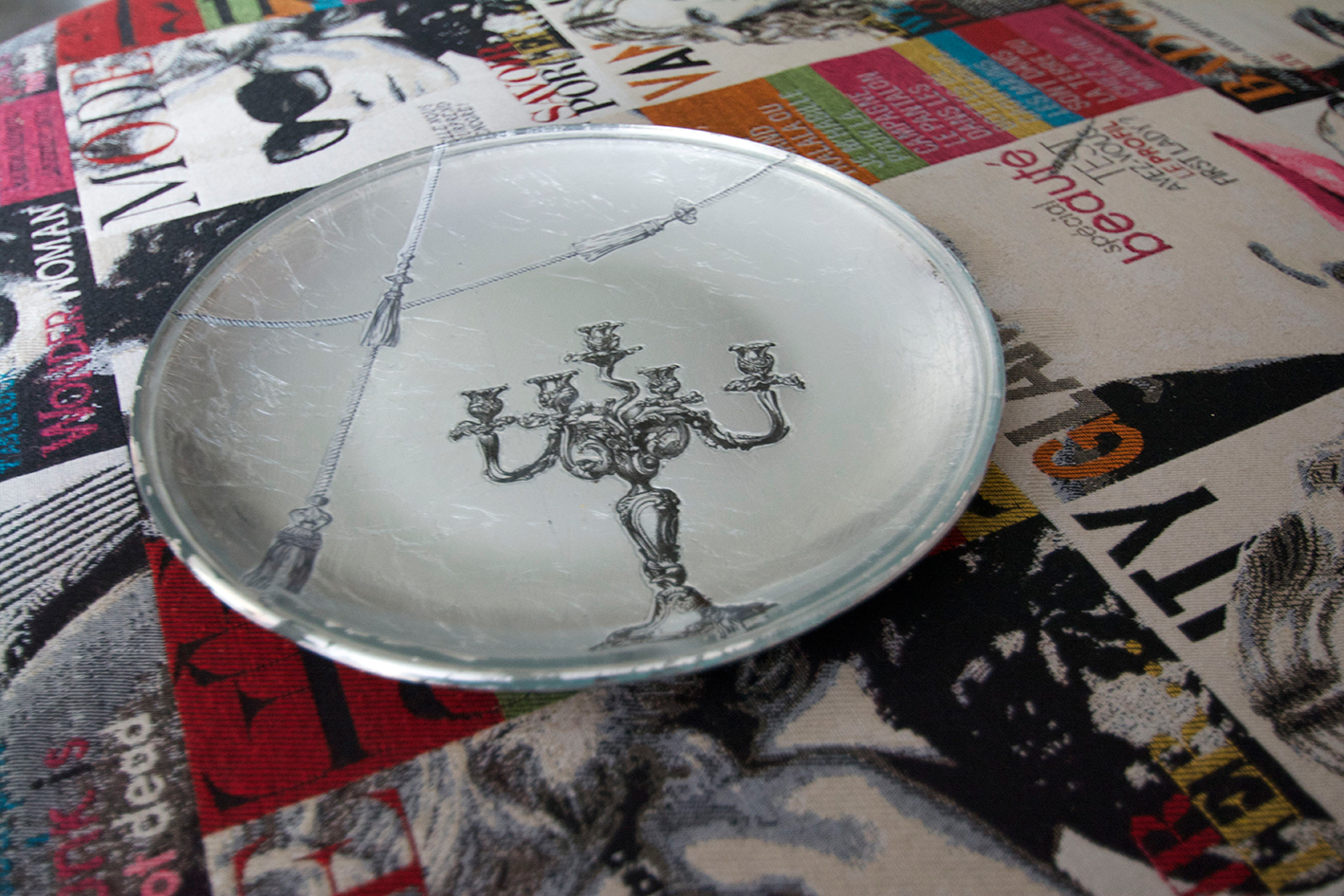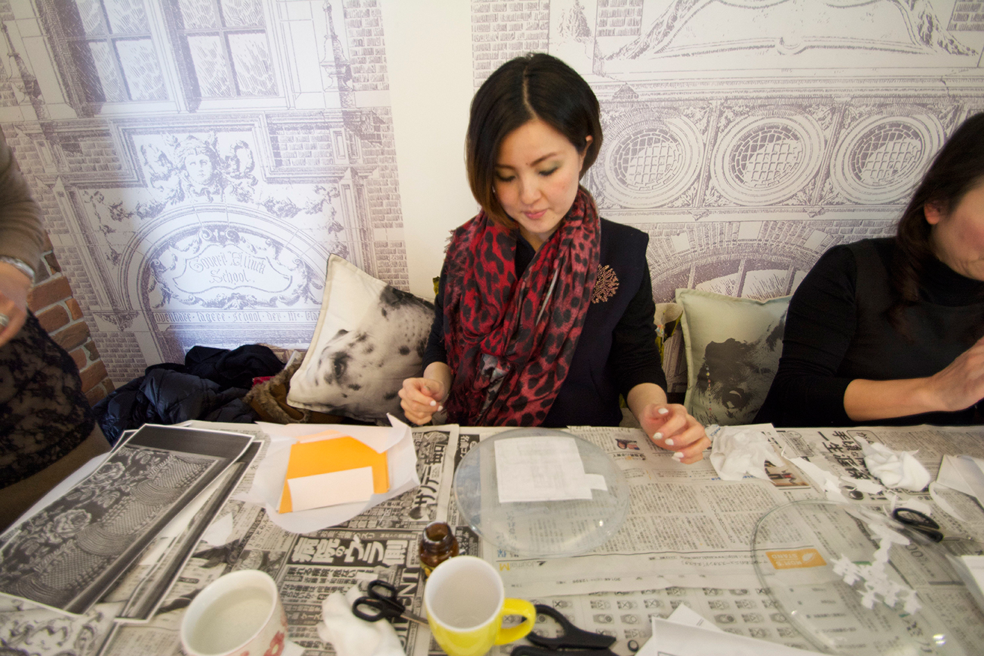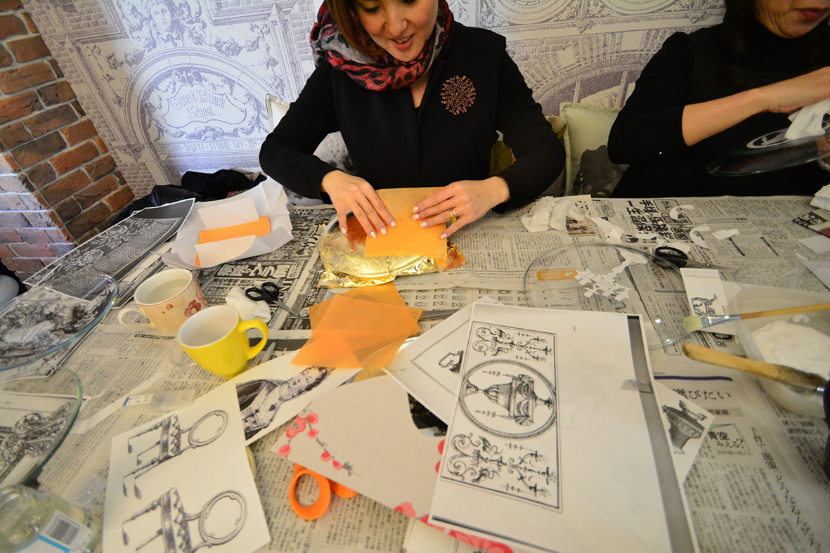 12月18日(木)にディクパージュのワークショップを開催いたしました。講師は山根さんです。ガラスの器に、自分の好きなモチーフを貼付けて、その上から金箔と銀箔を貼っていきます。難しいのかなと思っていたのですが、やり始めると意外に簡単で(山根さんの教え方が良かったのですね!)、みなさまとっても楽しそうにディクパされていました。