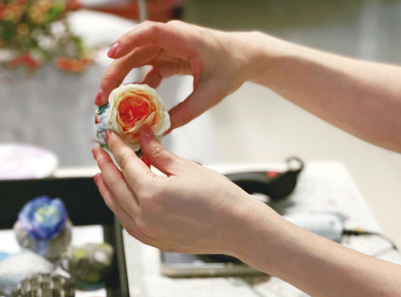 最後はお好みのリボンやタッセル、お花を付けて、唯一無二のアイテムとして仕上げていきます。