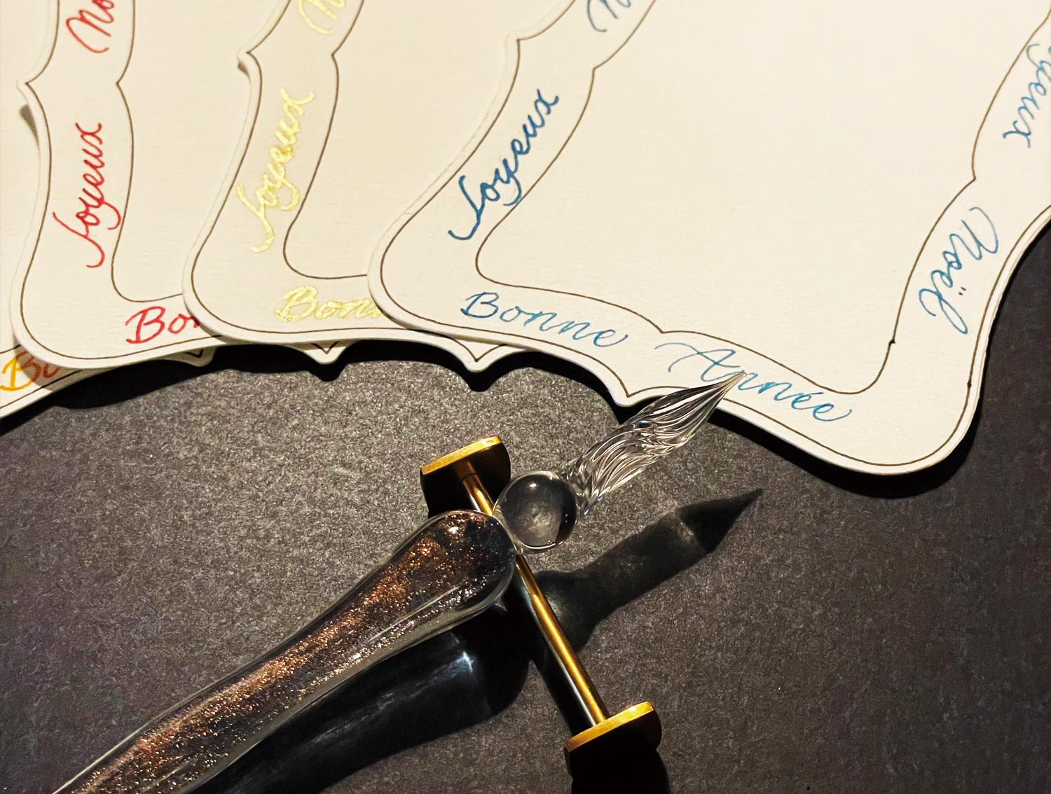 美しいガラスペン。ゴールドのインクも光が反射して華やかな雰囲気に!