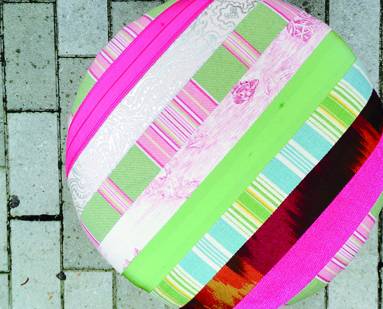 輸入生地の残布をつかってスツールでくり。合計100種類の生地から好きな生地を選びパッチワーク!タッセルやリボンを付けた… 夢はひろがります。プロのアドバイスを受けながらパターン合わせをします。