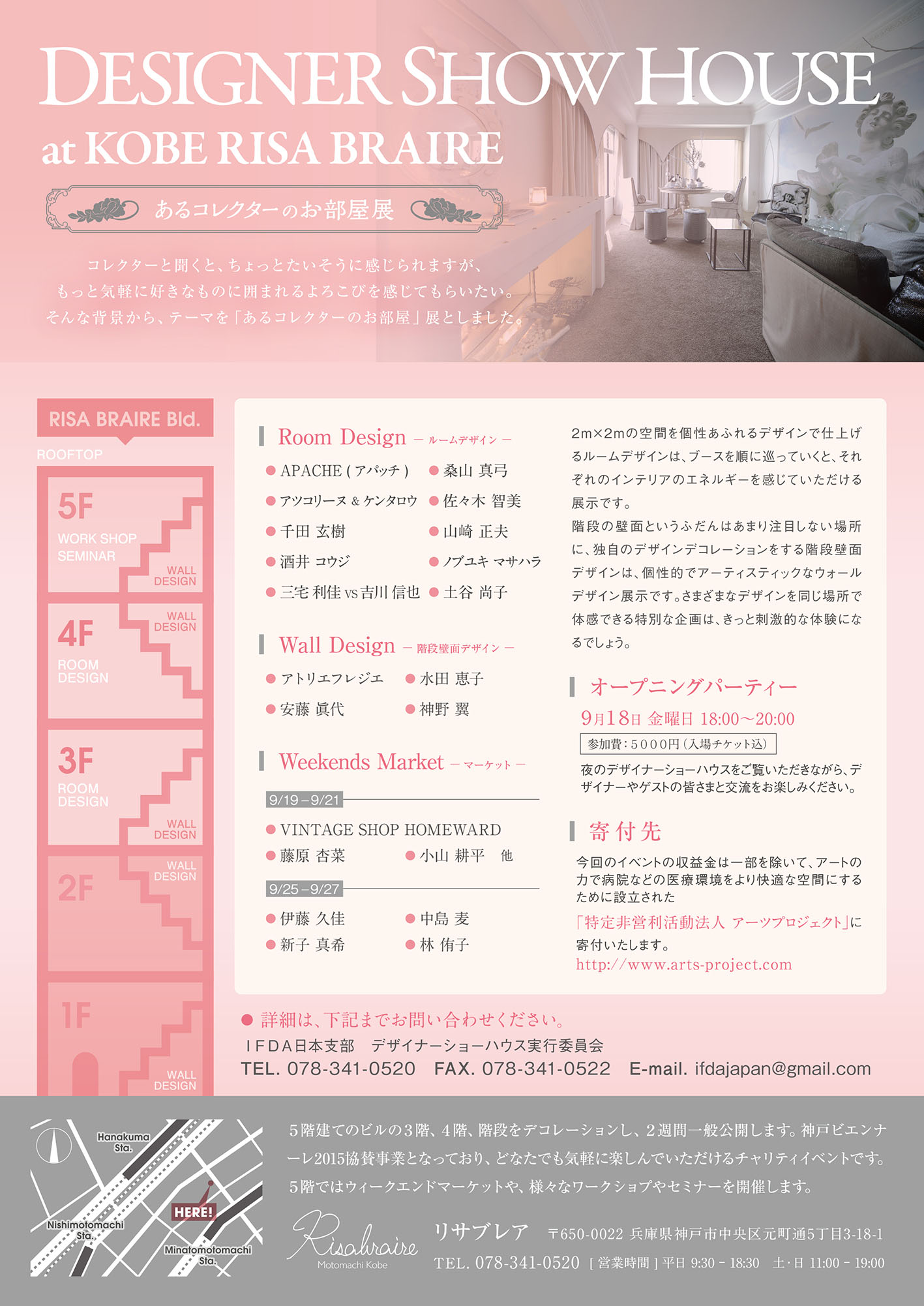 約40年前、アメリカで始まった歴史あるイベントです。邸宅やホテルなどにデザイナーが個性あるデザインデコレーションを施し、一般公開するイベントです。開催期間中には、ライフスタイル向上のためのセミナーやワークショップが開かれ、多くの来場者で賑わいます。入場料を含む全収益金は慈善団体に寄付されるインテリアチャリティーイベントであるため、デザイナーも運営ボランティアも来場者もデザインを通してできる社会貢献に意義を感じることのできるイベントです。デザイン業界のIFDA日本支部では、関西で3度目の本イベントを神戸にて開催する運びになりました。※今回のチャリティー先は、特定非営利活動法人アーツプロジェクトとなります。