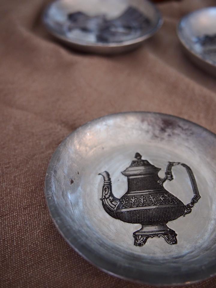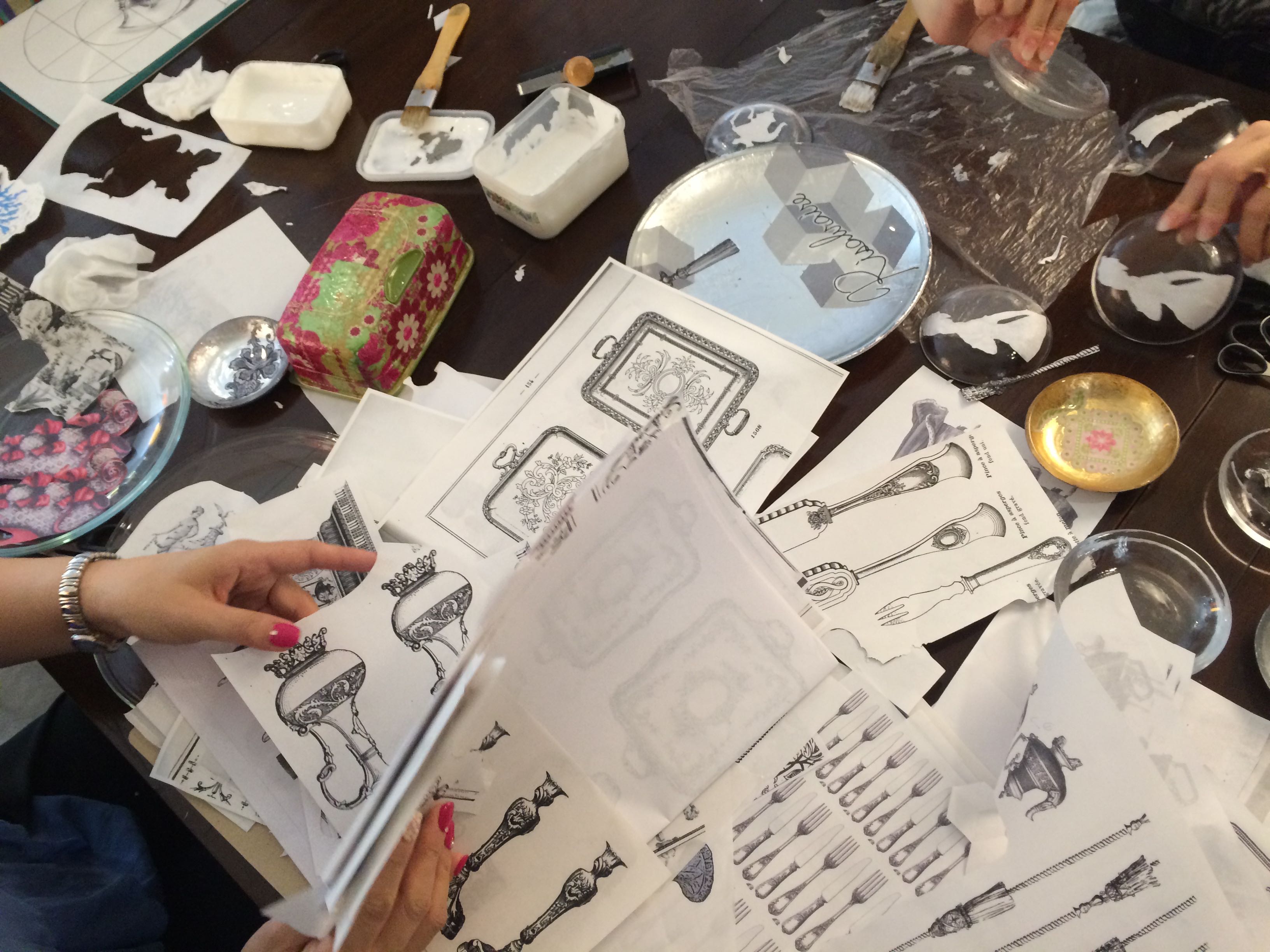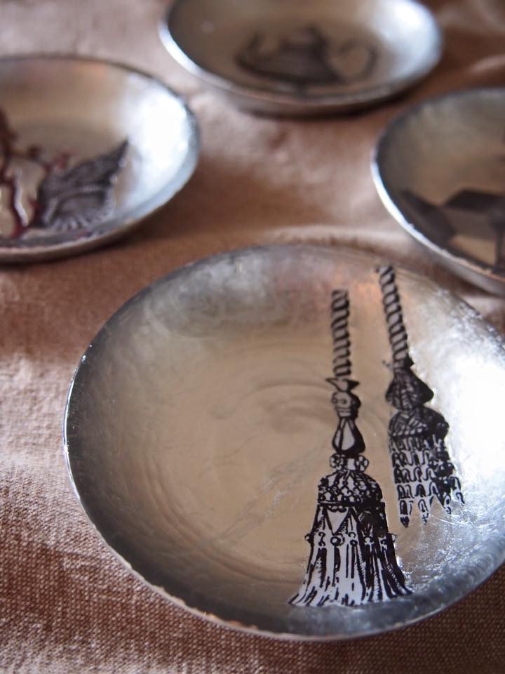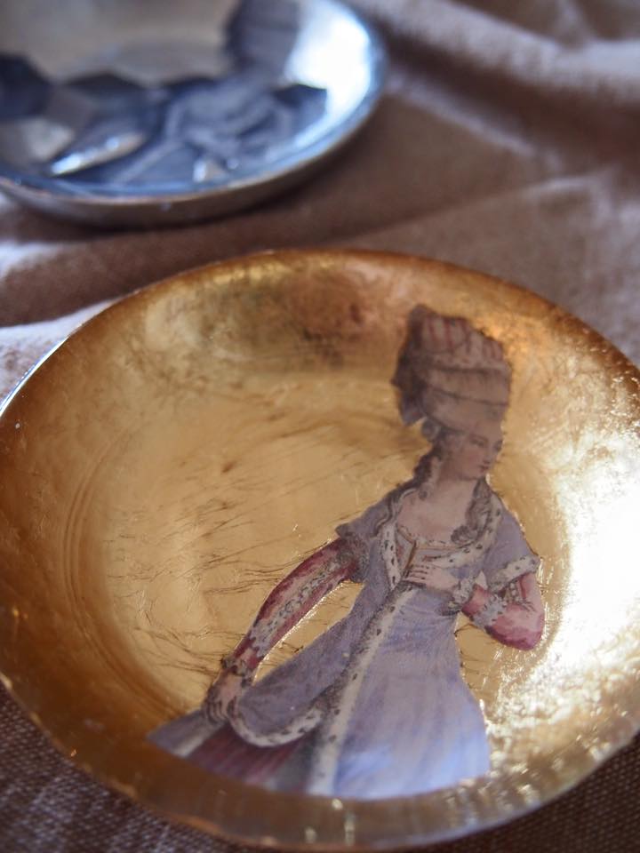 日常でも使える銀箔金箔を使ったモダンでクールなディクパージュのお皿づくりのワークショップ。ガラスのお皿の裏側から泊やモチーフを貼り、ニスでコーティングしますので、通常通り食事用としてご使用頂けます。(食洗機でのご使用はおやめください)