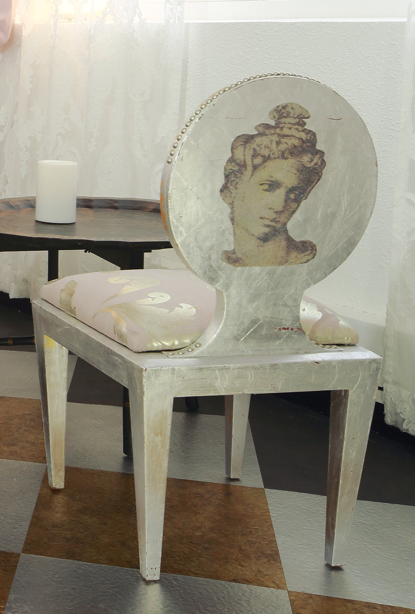 ご自宅にある椅子やテーブル脚を、箔やイラストを貼って甦らせます!下地に塗装すればアンティーク調の仕上げもできますし、箔の上にイラストを切り抜いて貼っても面白いかと思います!初めての方でも大丈夫です。少し荒く仕上がっても、それが深みへと変わるのがディクパージュの魅力です。椅子の場合は、生地の貼り替えも弊社でお受けしておりますのでお気軽にお問い合わせください。