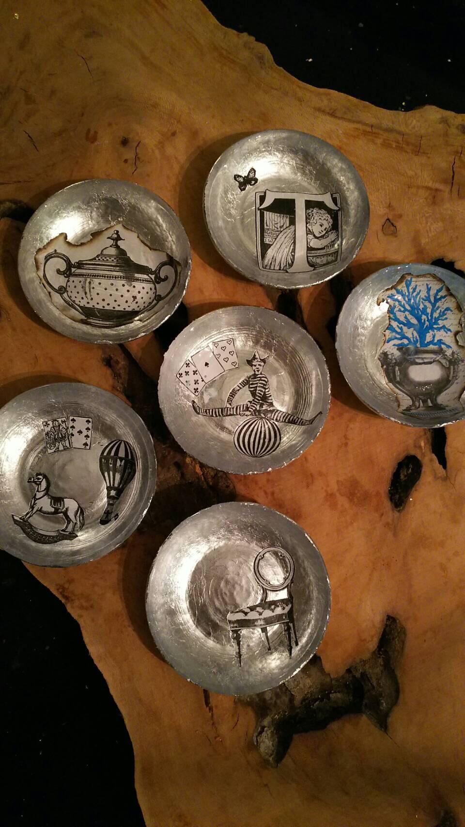 日常でも使える銀箔金箔を使ったモダンでクールなディクパージュのお皿づくりのワークショップ。ガラスのお皿の裏側から泊やモチーフを貼り、ニスでコーティングしますので、通常通り食事用としてご使用頂けます。(食洗機でのご使用はおやめください)