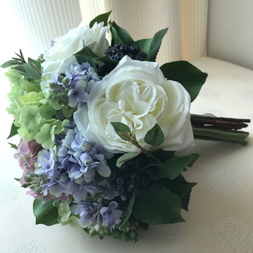 見本とは異なりますが、このブーケにぴったりのとても素敵なローズが入荷しているそうです。レッスンにはそちらを使われます。(フレンチナチュラルの編み込みアレンジに使用している