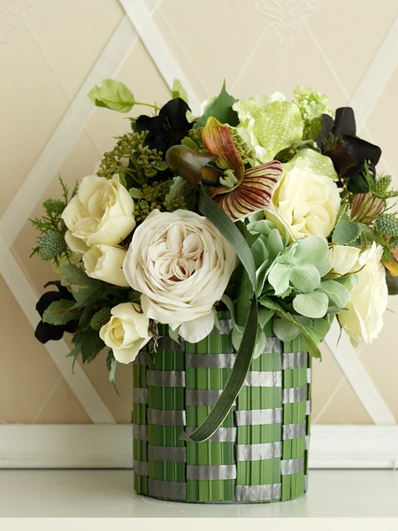 花器は金属とグリーンを編みこみ。アレンジはフレッシュ感を出すために高低差をつけながらかつラウンドにアレンジする上級者向けレッスン。お花初心者または初めての方は、ご希望により花器は事前にこちらでお作りすることが可能です。