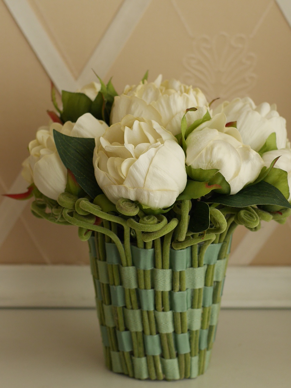 シャクヤクや他の副素材もすべてマットな質感にこだわったアレンジ。花器はリボンを使い編み込んでおります。