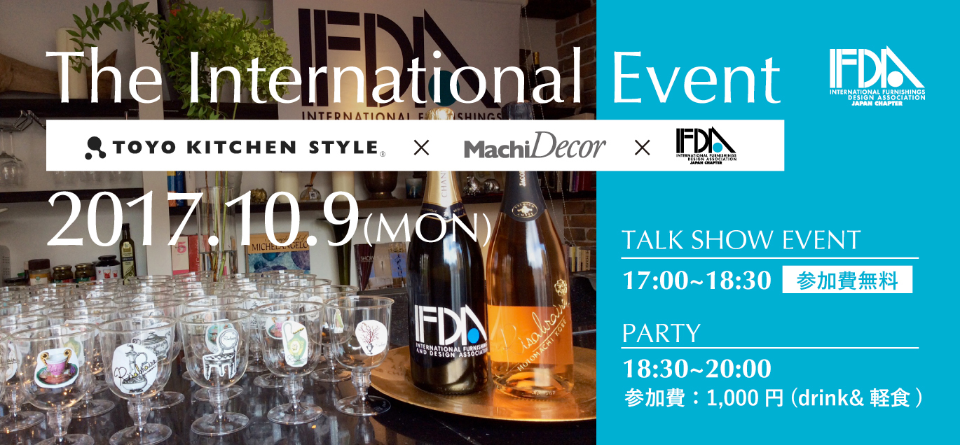 トークショーは無料。テーマは「ウェルカムホーム」、アメリカのホームパーティやソーシャルパーティのお話をしてもらいます。そのあとのパーティは「ウェルカムホーム」のコンセプトに合わせ、IFDA日本支部のメンバーのポットラック(持ち寄り)となります。