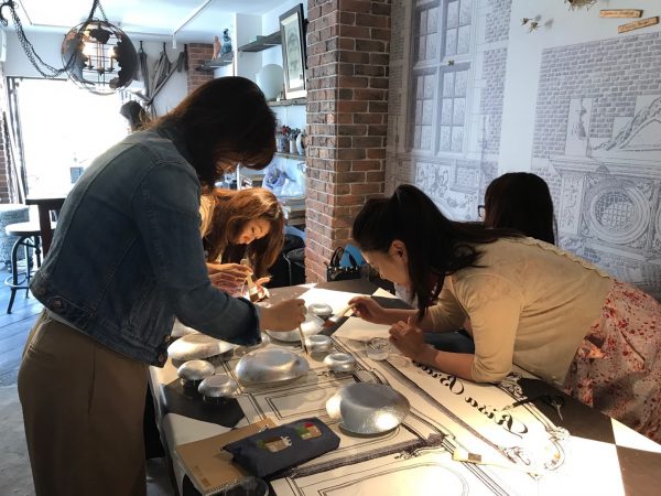 ワークショップの様子。箔を貼った後にニスを数回塗布して完成!