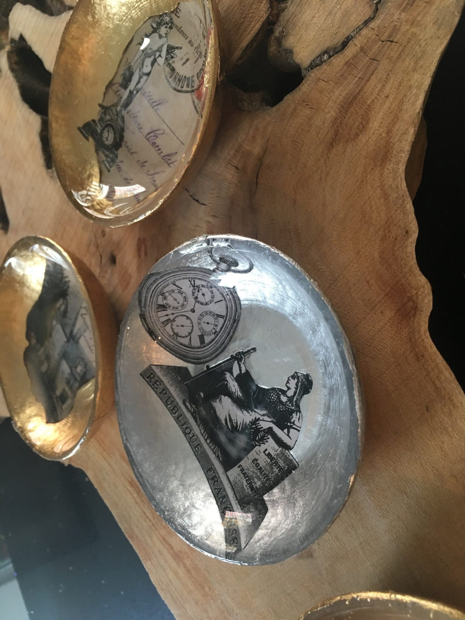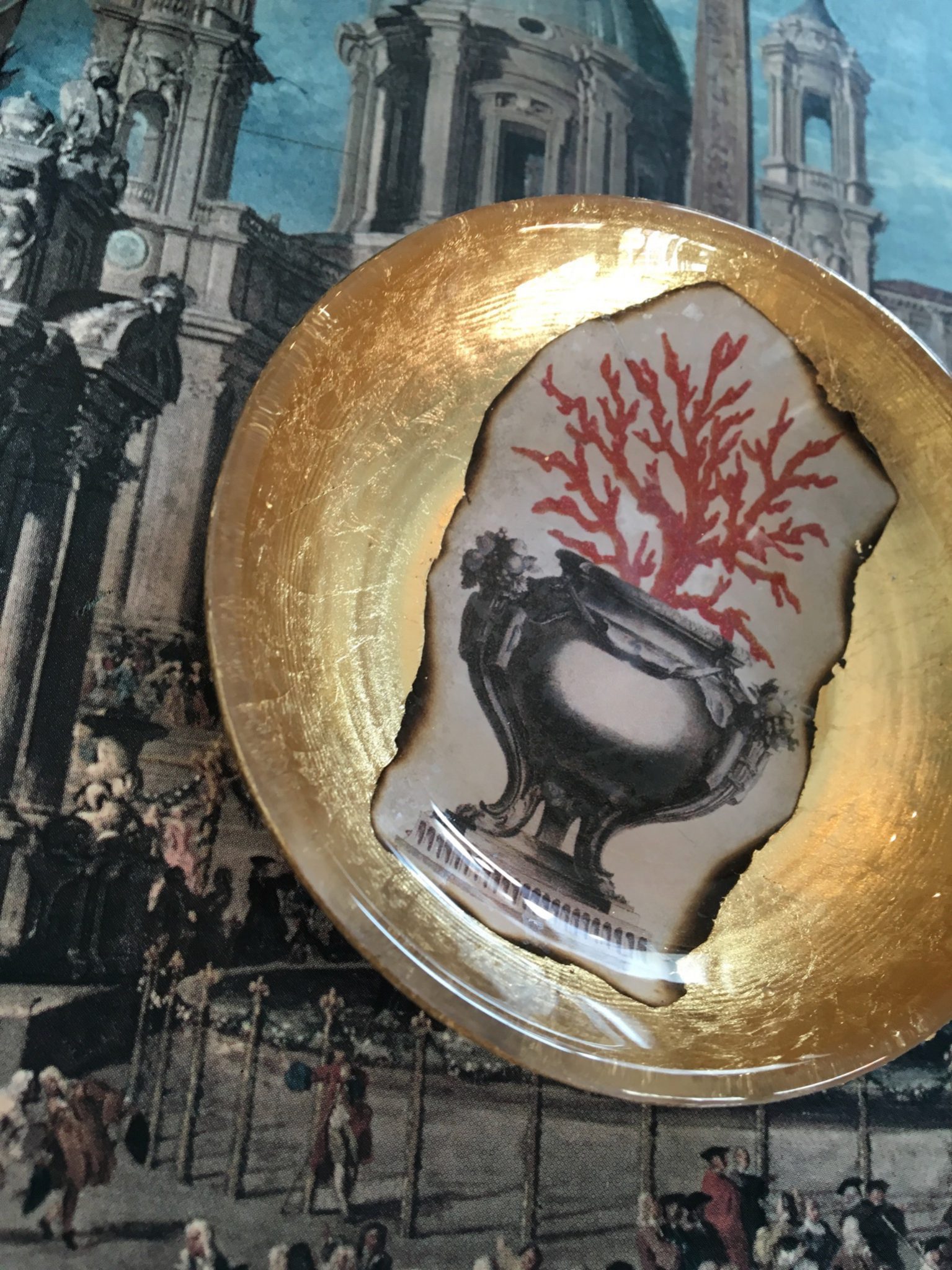 日常でも使える銀箔金箔を使ったモダンでクールなディクパージュのお皿づくりのワークショップ。ガラスのお皿の裏側から泊やモチーフを貼り、ニスでコーティングしますので、通常通り食事用としてご使用頂けます。(食洗機でのご使用はおやめください)