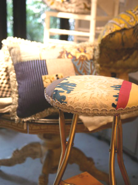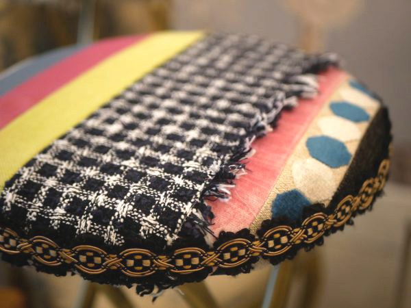 こちらが前回のスツールのワークショップで完成した作品!雰囲気の違う生地でもパッチワークにすると見事に調和されちゃいます!
