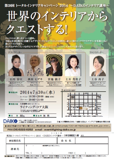 7月30日にライティングコア大阪で下記のようにセミナーをいたします。今回のテーマはあまり行かないような国のインテリアや旅行記などのお話をいたします。西垣ヒデキさんはパキスタン、宮地さんはアルゼンチン、土井先生はモロッコ、わたしはメキシコシティを訪れた時のことをスライドをまじえてお話いたします。失敗やら驚き、納得や感動など知らない国へ行くことは新しい発見がいっぱいです。