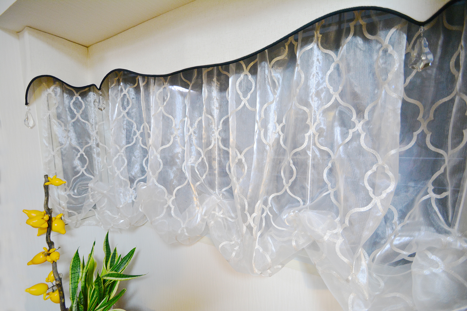 ちょっと引いて撮影した写真がこちらです。手前には出窓は、フローレンスシルバー、そこにシンプルなバランスを付けクリスタルをポイントに使っています。すべてのカーテンを同じ仕上げると単一的になってしまいますので、出窓の特徴をいかしてバルーン仕上げにしました。レースのふわっとした素材感がとてもキレイです。