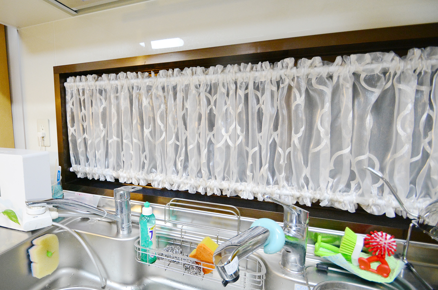 キッチン窓にはギャザー仕上げ。同じ生地を使っているのですが、仕上げによって雰囲気をかえてしまえるのが、カーテンの…ファブリックの魅力です!