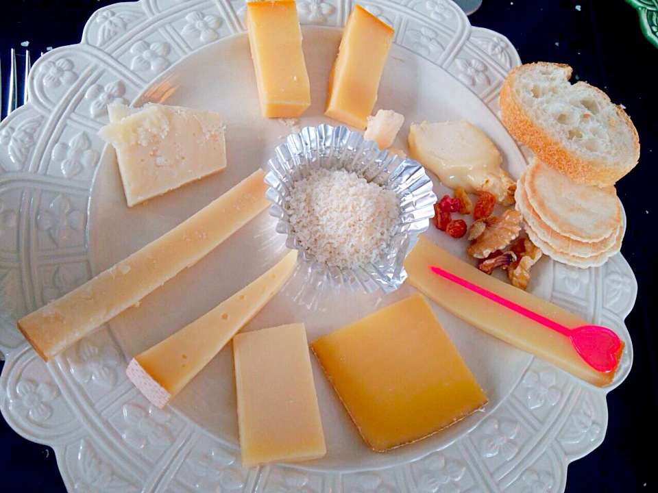 毎回コンセプトを変えたチーズの紹介とそれに合うワインのお勉強、のあとはみんなで飲んで味わう、遊びながら学べるパーティです。今回のコンセプトは「山のチーズでハイジ気分」でした。写真にある通り、10種類程度のチーズを少しずつ味わっていただきます。
