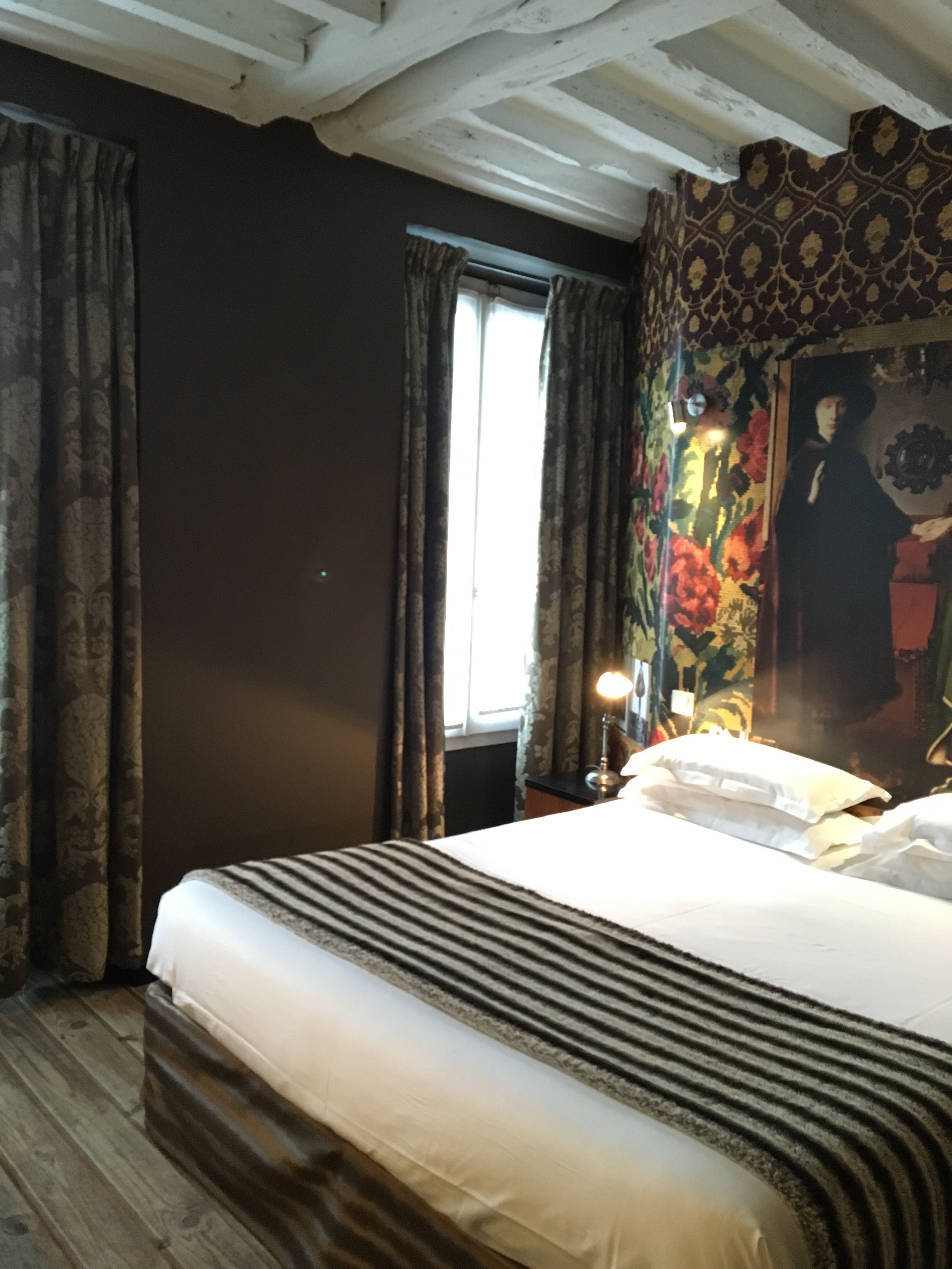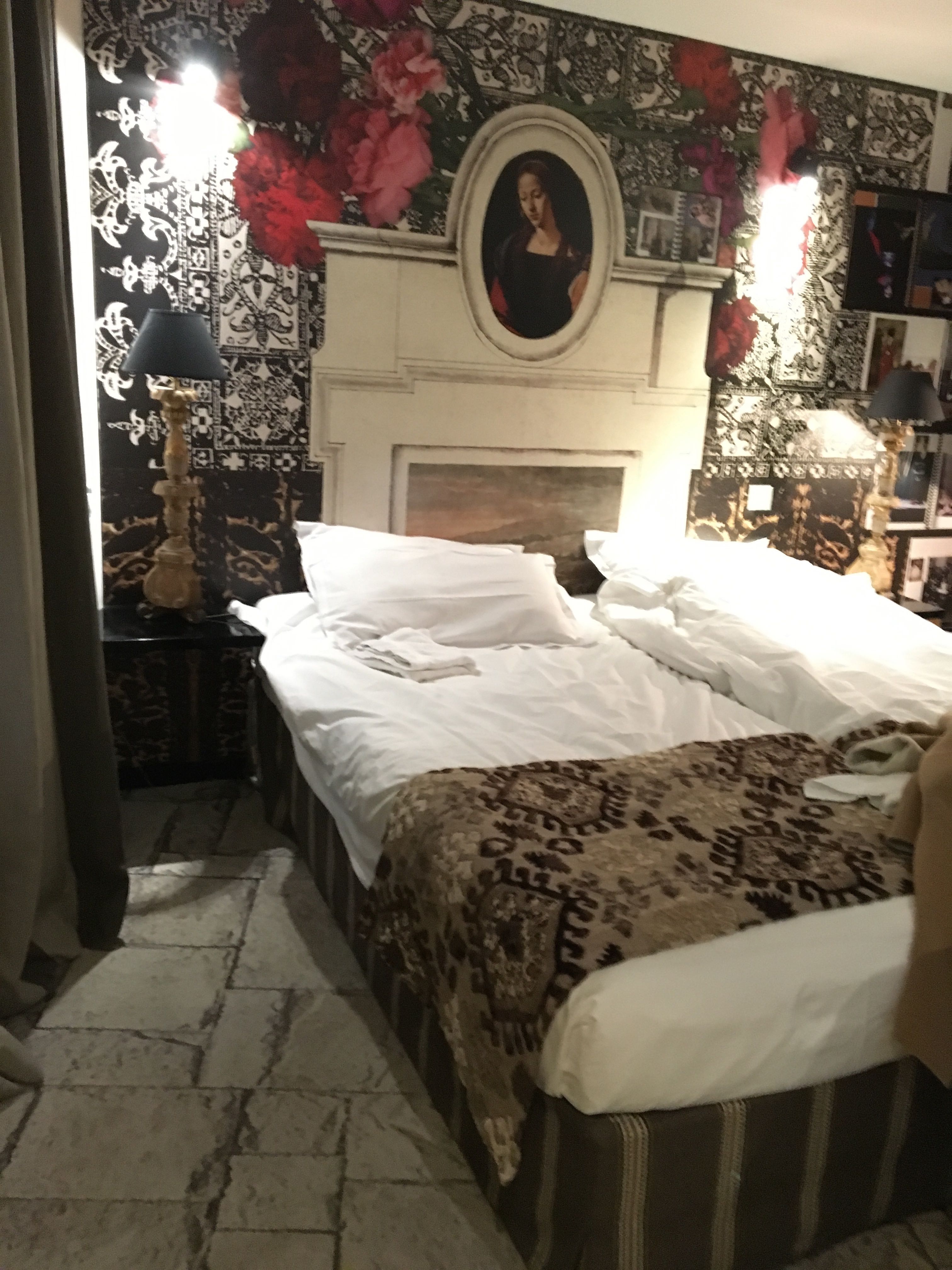 出発するときに部屋の写真を撮影したのでベットメイキングは乱れておりますが…このお部屋は圧巻です!カーペットは石畳みのようなプリントで、ベットヘッドは壁紙印刷。何から何までラクロアの世界観です。