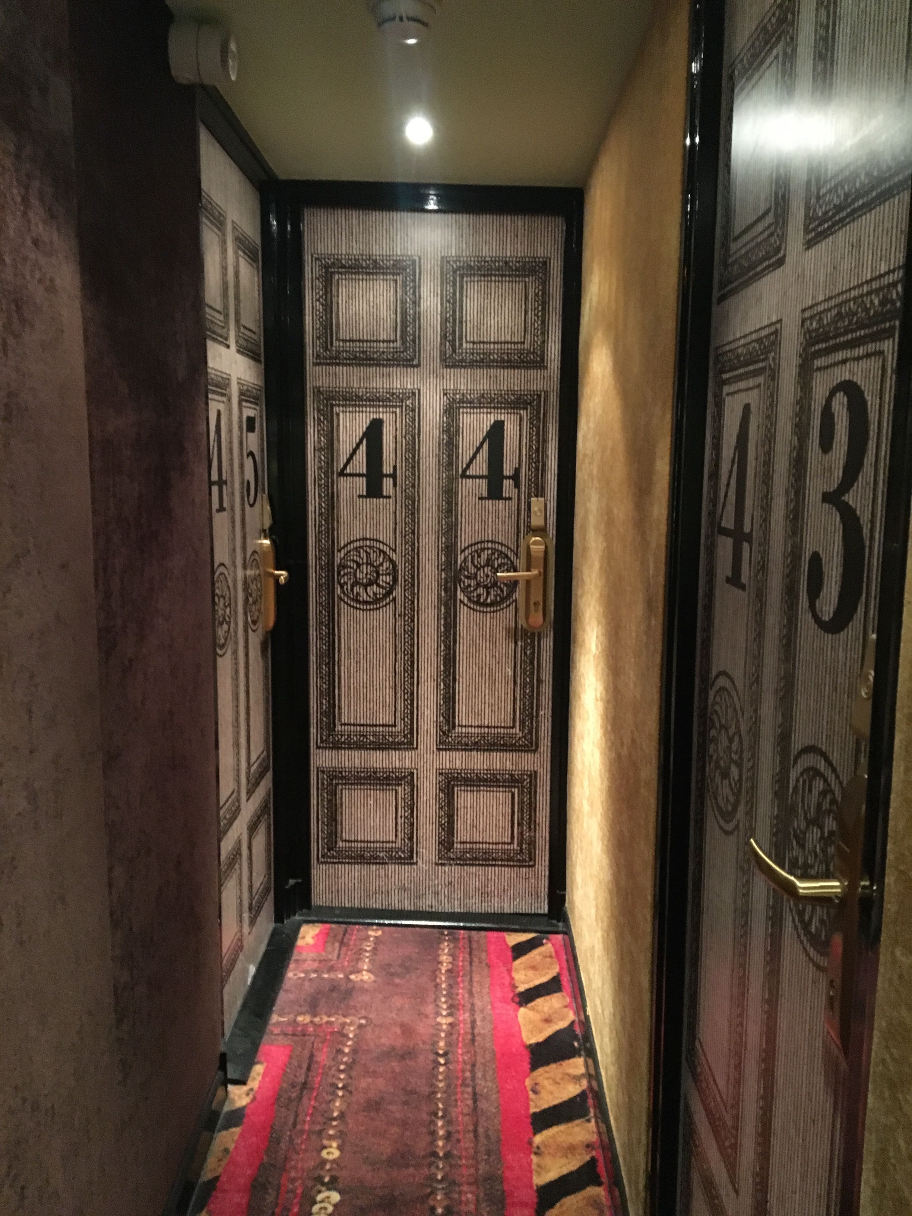 部屋に入るまでがまた面白い。廊下には様々な色が使われており、各部屋の扉の印刷も全て統一されていて不思議の国のアリスのようです。