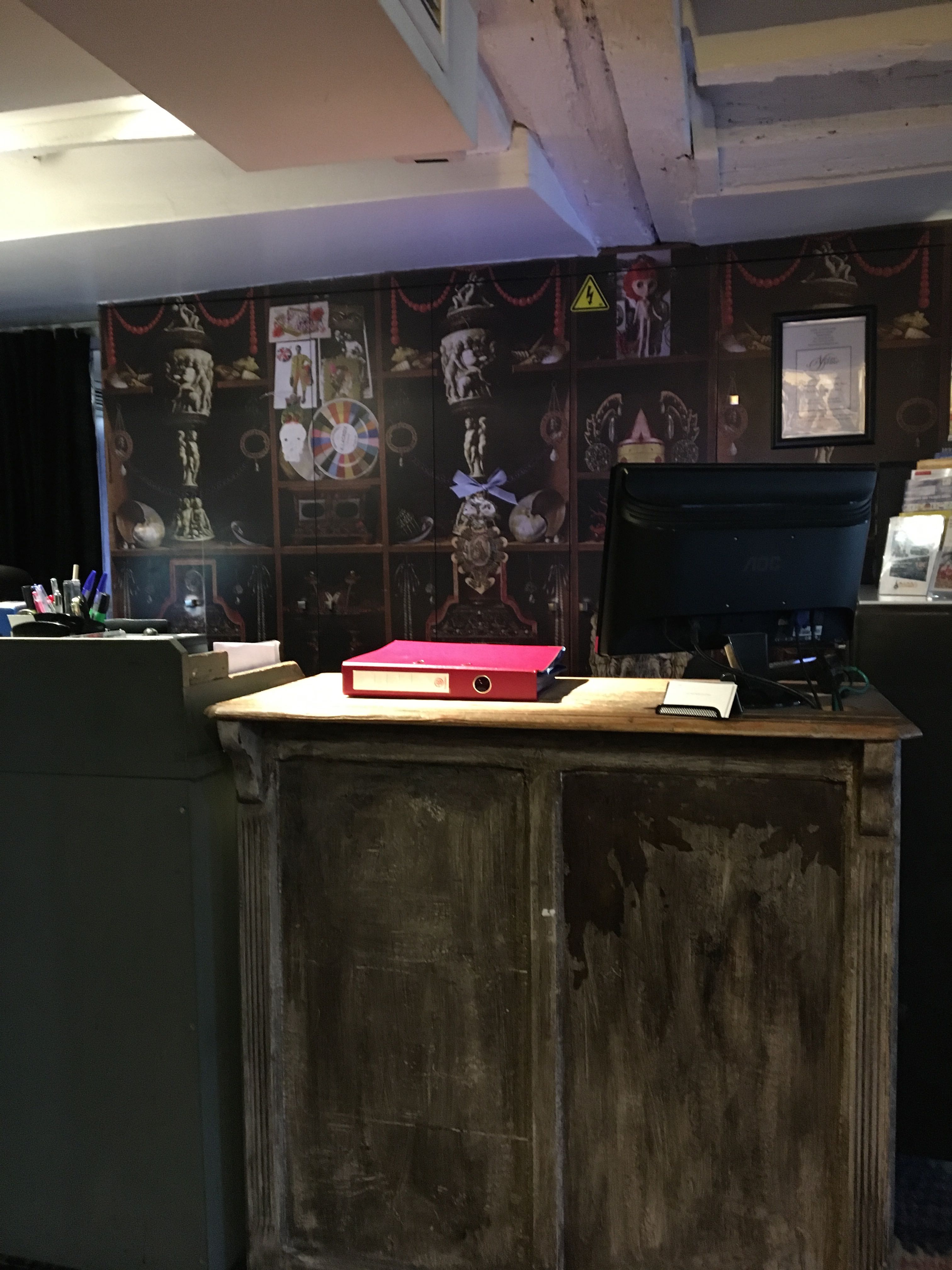 これがフロントです。全てがコンパクトですが、アンティークのデスクと背景のクロス、天井の低さが独特の雰囲気なんです。雑然と物が置かれているので、アットホームな感じもします。