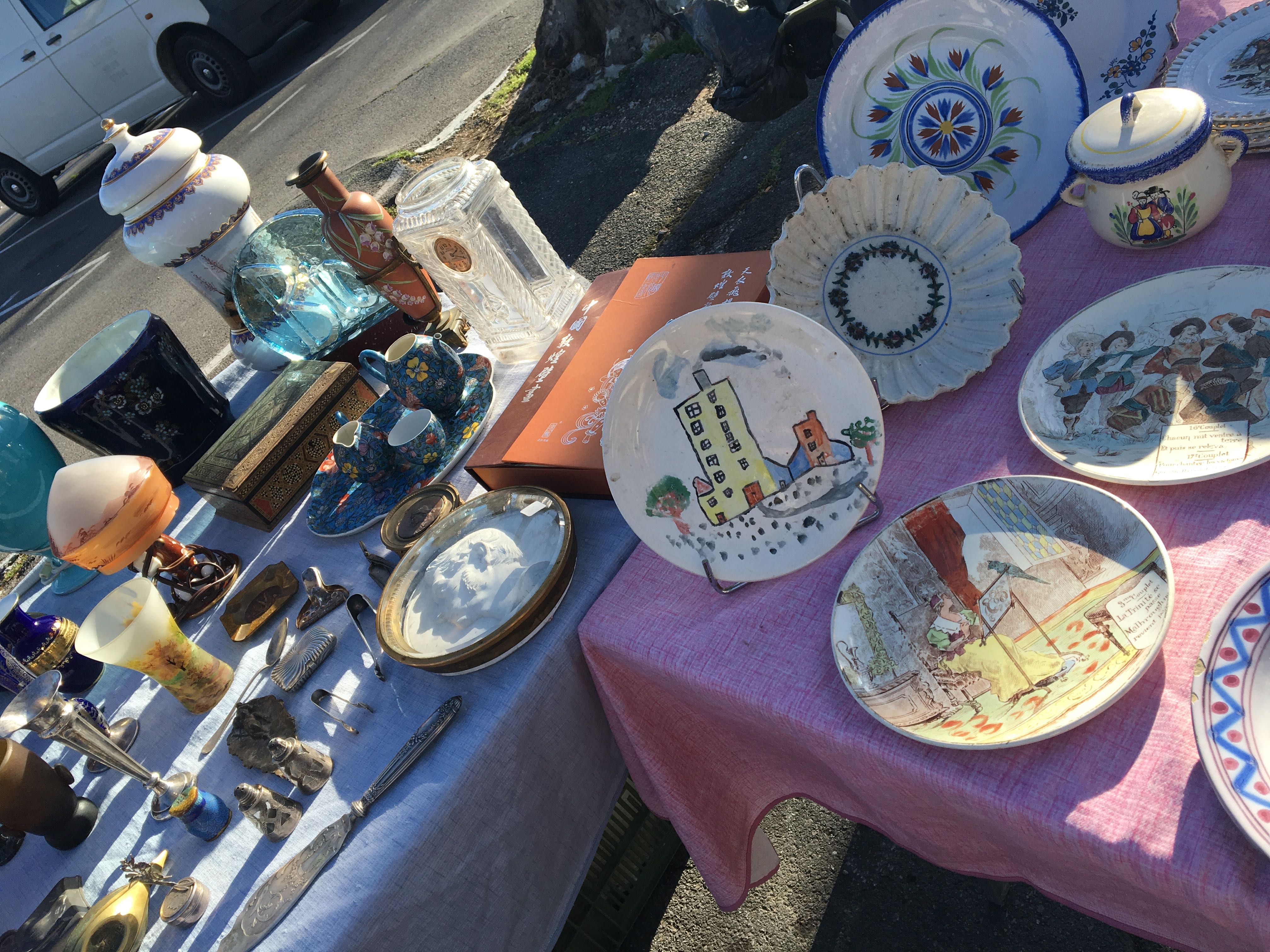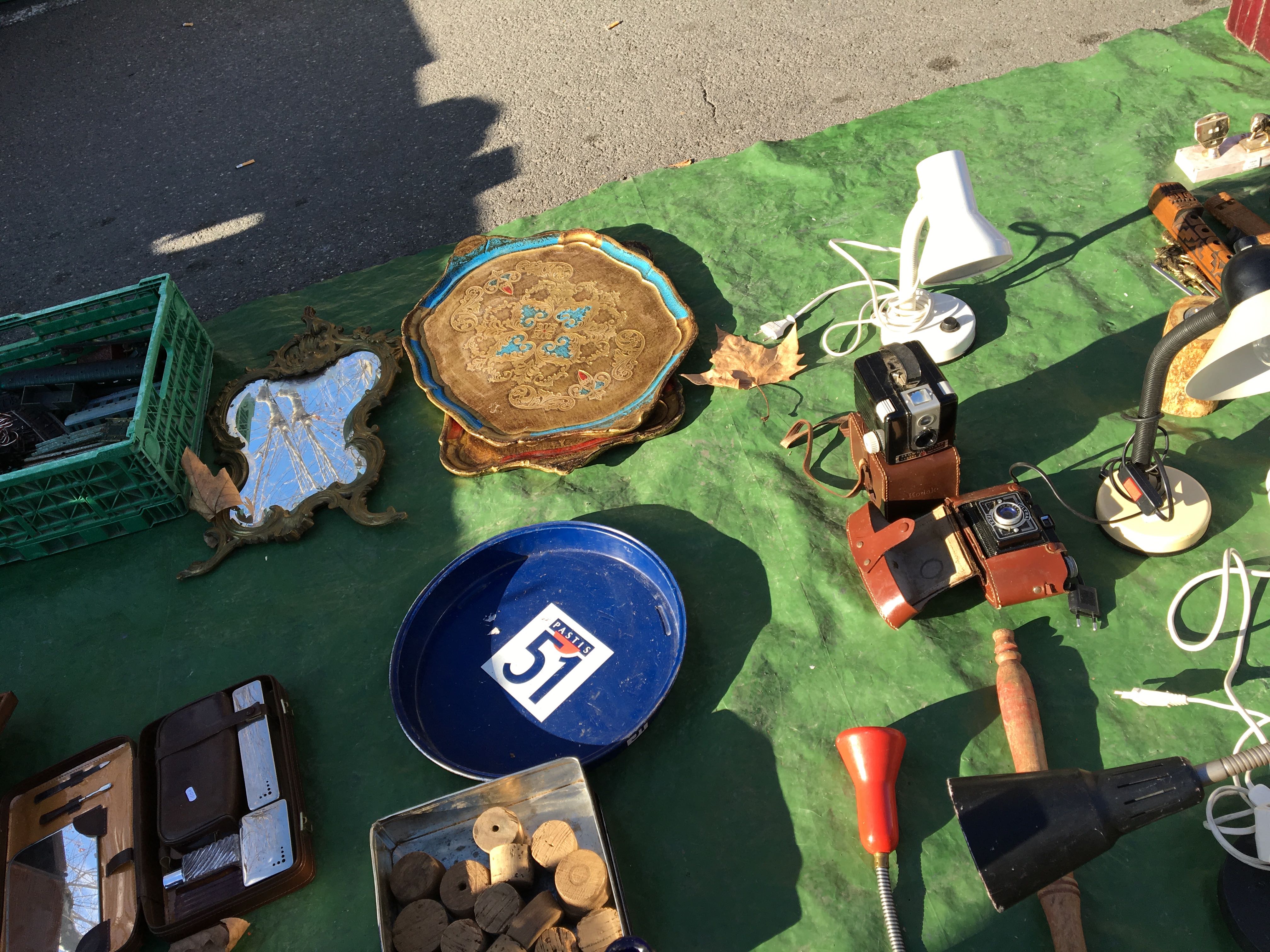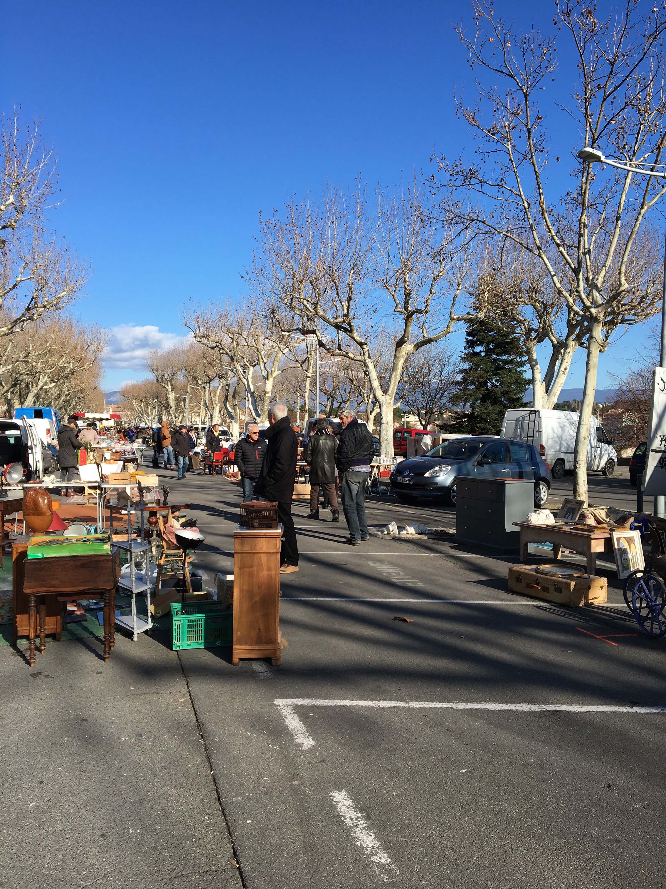 リル・シュル・ラ・ソルグのアンティーク市を後にし、次は友人がオススメしてくれたカルパントラの蚤の市へ!電車で30分程行くと駅にたどり着いたのですが、駅前には何もなく駅員さんもいないので、住民の方に聞いて駅から10分程歩いた広場に辿り着くと、50軒程露店が並んでいました。カルパントラの蚤の市は、プロと一般市民のお店が入り混じっていて活気がありました。商品もリルより安く、雑貨の品揃えも豊富!