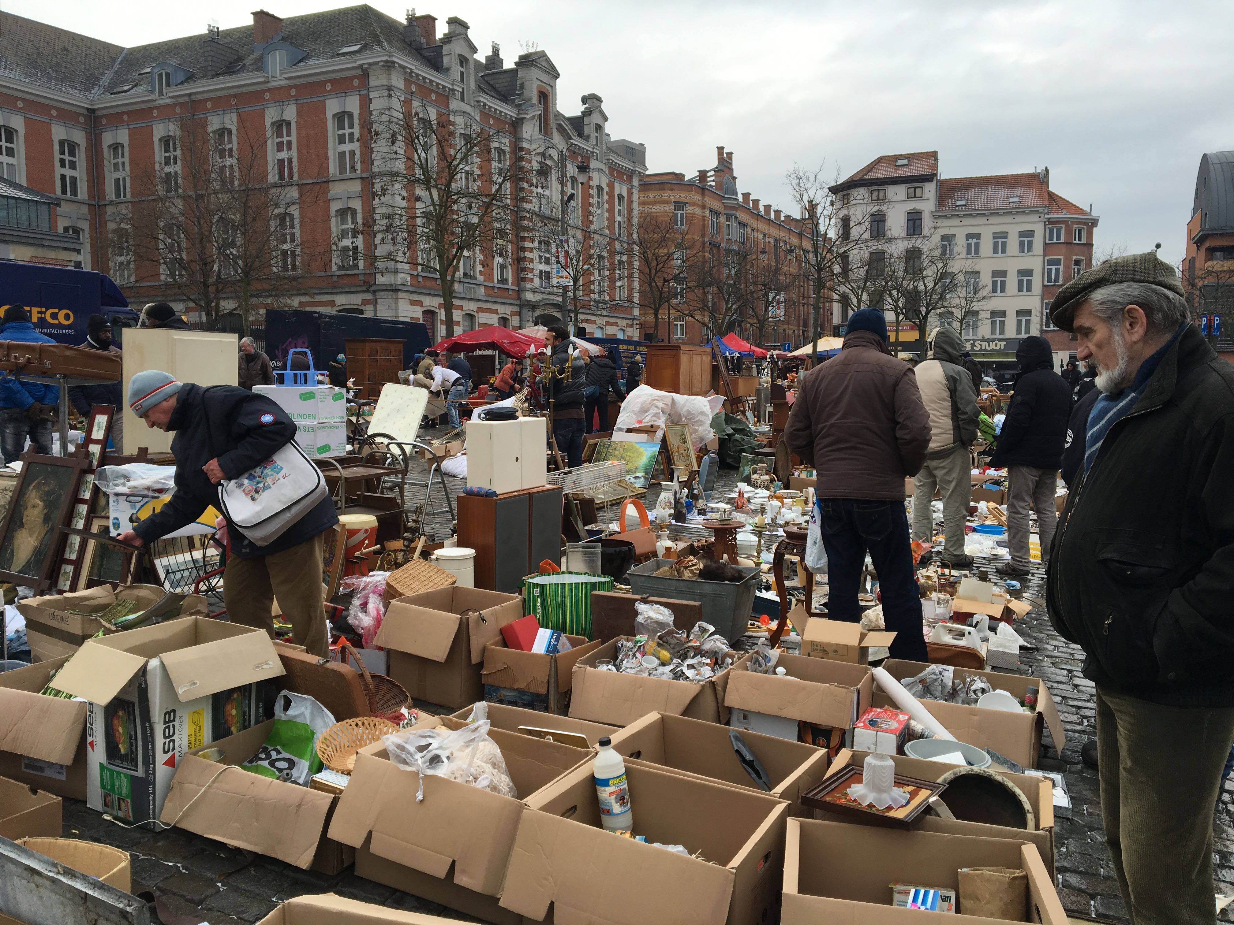ジュ・ド・バル広場の蚤の市は、100軒程の露店が並んでいました。時間が経つにつれて人が増えてきて、最後の方には全商品タダになるお店もあり人だかりになっていました。何があるか分からない、でも絶対に何かある!と言う希望を胸に時間を掛けてじっくり吟味する事がこの蚤の市の魅力です。南仏と比べるとブリュッセルはとても寒いので、冷たくなる手を擦りながらの宝物探しですが、とても楽しいですよ!
